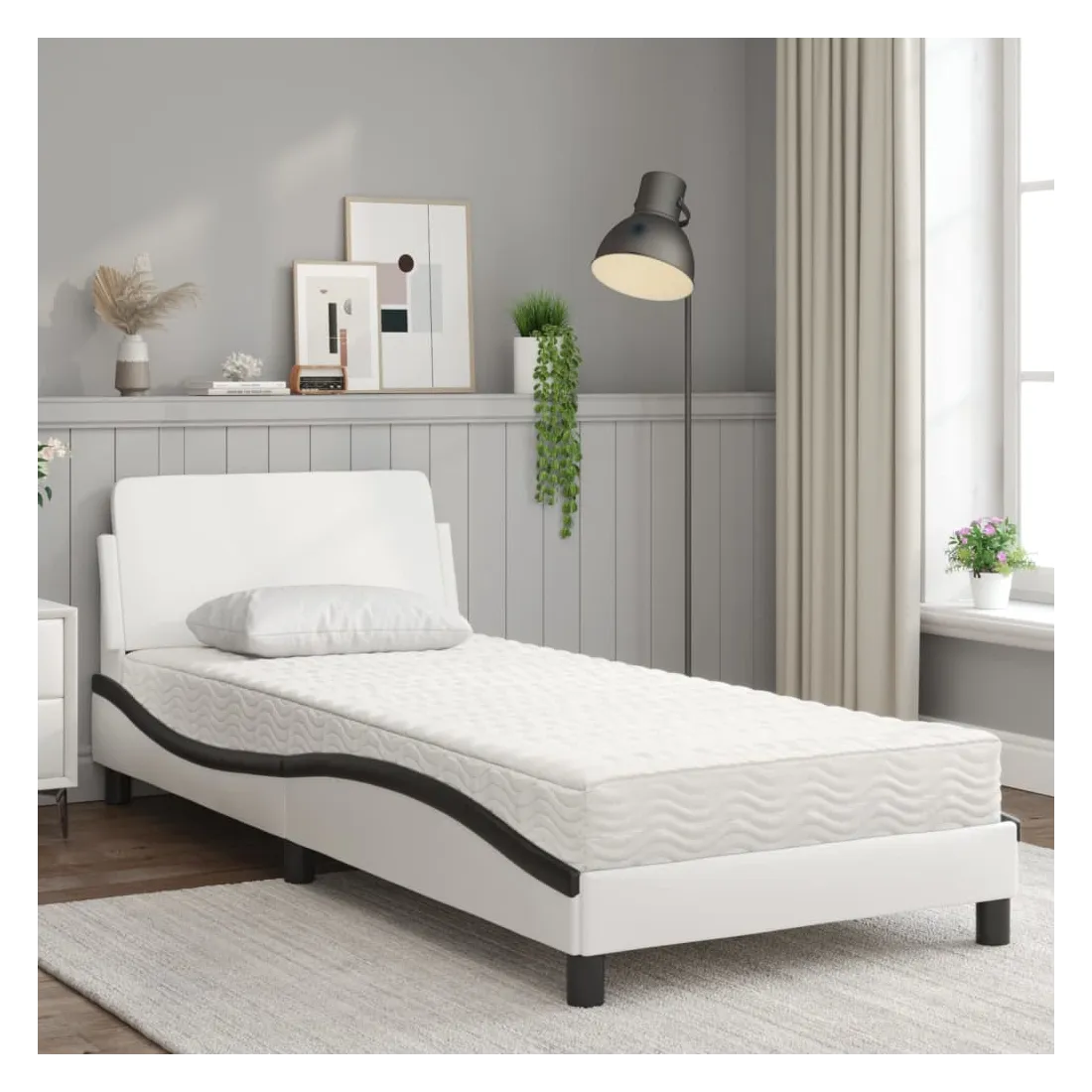 Obtenez une meilleure nuit de sommeil reposante grâce à ce lit avec matelas ! Il est un supplément accueillant à toute chambre à coucher. Similicuir durable : le similicuir de qualité supérieure est un matériau très durable. Il est résistant aux taches, ce qui le rend facile à nettoyer avec un chiffon humide. La surface lisse donne également un aspect luxueux et la beauté du cuir véritable.Lattes de contreplaqué : les lattes de contreplaqué assurent une bonne répartition du poids, garantissant que le matelas reste en place à chaque torsion de votre corps pendant le sommeil.Excellent soutien : la tête de lit vous offre un excellent soutien du dos lorsque vous êtes assis dans votre lit pour lire ou regarder la télévision.Matelas en mousse : ce matelas de lit en tissu à 3 couches est rempli de mousse PU 22D pour un confort optimal. Il contribue à soulager la fatigue et à favoriser la circulation sanguine, vous offrant ainsi une relaxation complète et une bonne qualité de sommeil. En outre, le matelas est disponible en dureté H2 et H3, de sorte que vous pouvez simplement tourner le matelas pour choisir la dureté qui vous convient le mieux.Design latéral ondulé : l’aspect ondulé du cadre de lit est élégant et sophistiqué, ajoutant une touche moderne et élégante à votre décor, ce qui en fait le point central de votre chambre à coucher.
