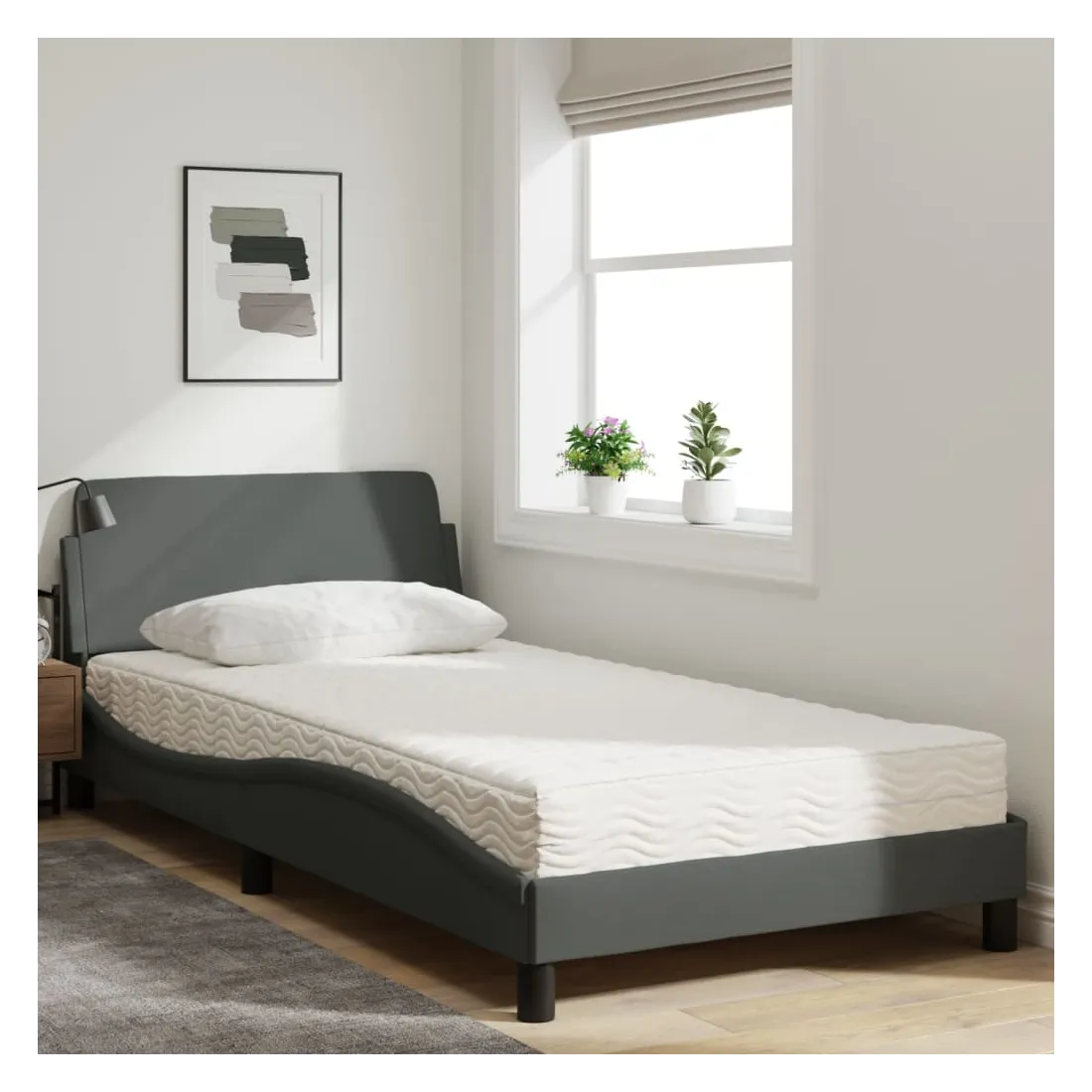Obtenez une meilleure nuit de sommeil reposante grâce à ce lit avec matelas ! Il est un supplément accueillant à toute chambre à coucher. Tissu durable : le tissu présente un aspect simple et épuré, et il est respirant et durable.Lattes de contreplaqué : les lattes de contreplaqué assurent une bonne répartition du poids, garantissant que le matelas reste en place à chaque torsion de votre corps pendant le sommeil.Excellent soutien : la tête de lit vous offre un excellent soutien du dos lorsque vous êtes assis dans votre lit pour lire ou regarder la télévision.Matelas en mousse : ce matelas de lit en tissu à 3 couches est rempli de mousse PU 22D pour un confort optimal. Il contribue à soulager la fatigue et à favoriser la circulation sanguine, vous offrant ainsi une relaxation complète et une bonne qualité de sommeil. En outre, le matelas est disponible en dureté H2 et H3, de sorte que vous pouvez simplement tourner le matelas pour choisir la dureté qui vous convient le mieux.Design latéral ondulé : l’aspect ondulé du cadre de lit est élégant et sophistiqué, ajoutant une touche moderne et élégante à votre décor, ce qui en fait le point central de votre chambre à coucher.