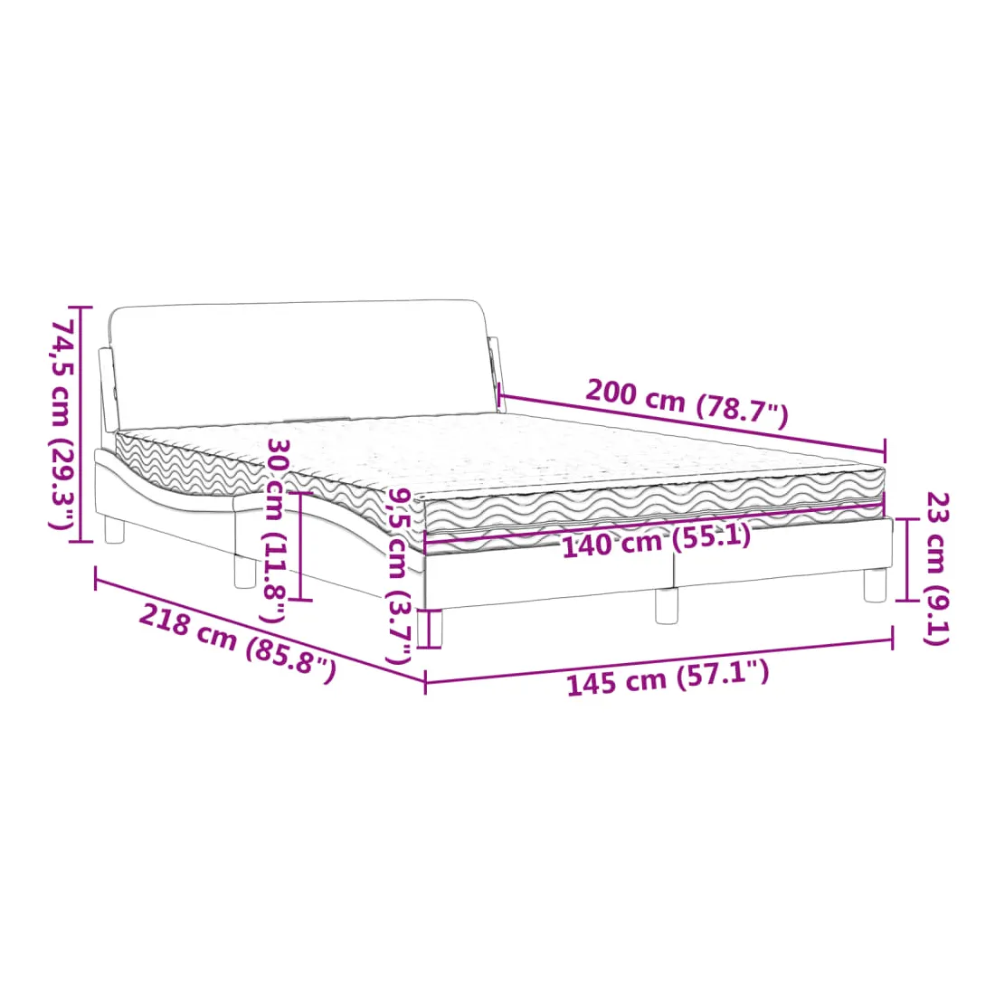 Obtenez une meilleure nuit de sommeil reposante grâce à ce lit avec matelas ! Il est un supplément accueillant à toute chambre à coucher. Similicuir durable : le similicuir de qualité supérieure est un matériau très durable. Il est résistant aux taches, ce qui le rend facile à nettoyer avec un chiffon humide. La surface lisse donne également un aspect luxueux et la beauté du cuir véritable.Lattes de contreplaqué : les lattes de contreplaqué assurent une bonne répartition du poids, garantissant que le matelas reste en place à chaque torsion de votre corps pendant le sommeil.Excellent soutien : la tête de lit vous offre un excellent soutien du dos lorsque vous êtes assis dans votre lit pour lire ou regarder la télévision.Matelas en mousse : ce matelas de lit en tissu à 3 couches est rempli de mousse PU 22D pour un confort optimal. Il contribue à soulager la fatigue et à favoriser la circulation sanguine, vous offrant ainsi une relaxation complète et une bonne qualité de sommeil. En outre, le matelas est disponible en dureté H2 et H3, de sorte que vous pouvez simplement tourner le matelas pour choisir la dureté qui vous convient le mieux.Design latéral ondulé : l’aspect ondulé du cadre de lit est élégant et sophistiqué, ajoutant une touche moderne et élégante à votre décor, ce qui en fait le point central de votre chambre à coucher.