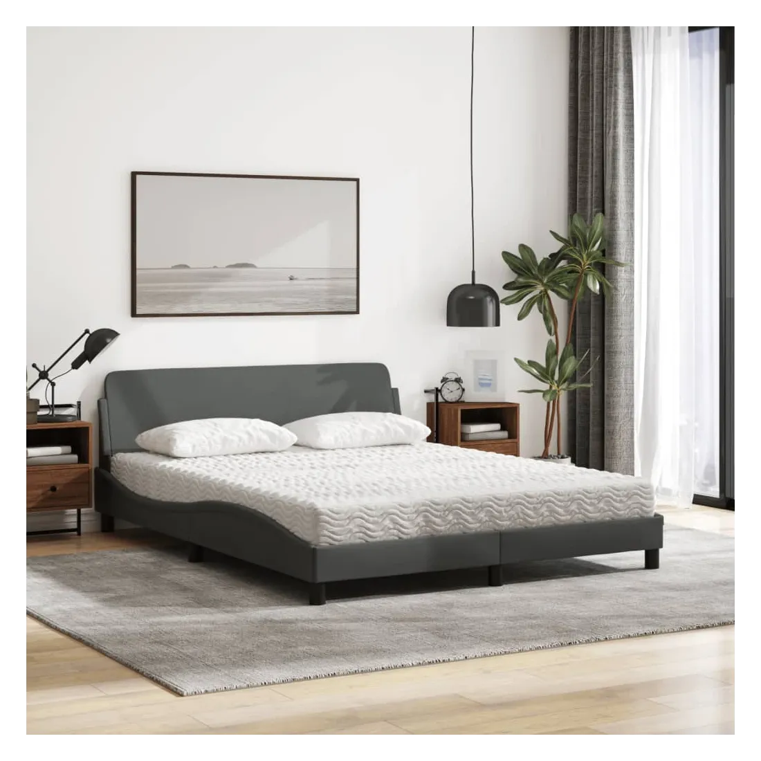 Obtenez une meilleure nuit de sommeil reposante grâce à ce lit avec matelas ! Il est un supplément accueillant à toute chambre à coucher. Tissu durable : le tissu présente un aspect simple et épuré, et il est respirant et durable.Lattes de contreplaqué : les lattes de contreplaqué assurent une bonne répartition du poids, garantissant que le matelas reste en place à chaque torsion de votre corps pendant le sommeil.Excellent soutien : la tête de lit vous offre un excellent soutien du dos lorsque vous êtes assis dans votre lit pour lire ou regarder la télévision.Matelas en mousse : ce matelas de lit en tissu à 3 couches est rempli de mousse PU 22D pour un confort optimal. Il contribue à soulager la fatigue et à favoriser la circulation sanguine, vous offrant ainsi une relaxation complète et une bonne qualité de sommeil. En outre, le matelas est disponible en dureté H2 et H3, de sorte que vous pouvez simplement tourner le matelas pour choisir la dureté qui vous convient le mieux.Design latéral ondulé : l’aspect ondulé du cadre de lit est élégant et sophistiqué, ajoutant une touche moderne et élégante à votre décor, ce qui en fait le point central de votre chambre à coucher.