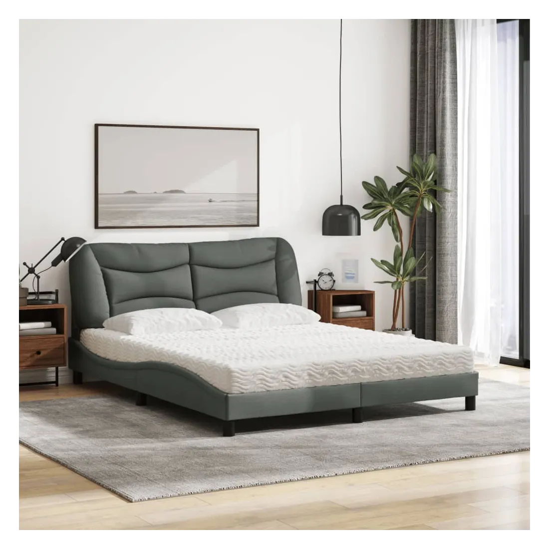 Obtenez une meilleure nuit de sommeil reposante grâce à ce lit avec matelas ! Il est un supplément accueillant à toute chambre à coucher. Tissu durable : le tissu présente un aspect simple et épuré, et il est respirant et durable.Lattes de contreplaqué : les lattes de contreplaqué assurent une bonne répartition du poids, garantissant que le matelas reste en place à chaque torsion de votre corps pendant le sommeil.Excellent soutien : la tête de lit vous offre un excellent soutien du dos lorsque vous êtes assis dans votre lit pour lire ou regarder la télévision.Matelas en mousse : ce matelas de lit en tissu à 3 couches est rempli de mousse PU 22D pour un confort optimal. Il contribue à soulager la fatigue et à favoriser la circulation sanguine, vous offrant ainsi une relaxation complète et une bonne qualité de sommeil. En outre, le matelas est disponible en dureté H2 et H3, de sorte que vous pouvez simplement tourner le matelas pour choisir la dureté qui vous convient le mieux.Design latéral ondulé : l’aspect ondulé du cadre de lit est élégant et sophistiqué, ajoutant une touche moderne et élégante à votre décor, ce qui en fait le point central de votre chambre à coucher.