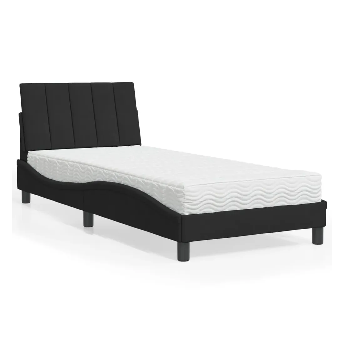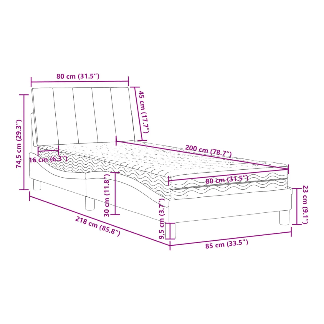 Obtenez une meilleure nuit de sommeil reposante grâce à ce lit avec matelas ! Il est un supplément accueillant à toute chambre à coucher. Velours doux : le velours est un tissu doux et confortable, agréable au toucher.Lattes de contreplaqué : les lattes de contreplaqué assurent une bonne répartition du poids, garantissant que le matelas reste en place à chaque torsion de votre corps pendant le sommeil.Excellent soutien : la tête de lit vous offre un excellent soutien du dos lorsque vous êtes assis dans votre lit pour lire ou regarder la télévision.Matelas en mousse : ce matelas de lit en tissu à 3 couches est rempli de mousse PU 22D pour un confort optimal. Il contribue à soulager la fatigue et à favoriser la circulation sanguine, vous offrant ainsi une relaxation complète et une bonne qualité de sommeil. En outre, le matelas est disponible en dureté H2 et H3, de sorte que vous pouvez simplement tourner le matelas pour choisir la dureté qui vous convient le mieux.Design latéral ondulé : l’aspect ondulé du cadre de lit est élégant et sophistiqué, ajoutant une touche moderne et élégante à votre décor, ce qui en fait le point central de votre chambre à coucher.
