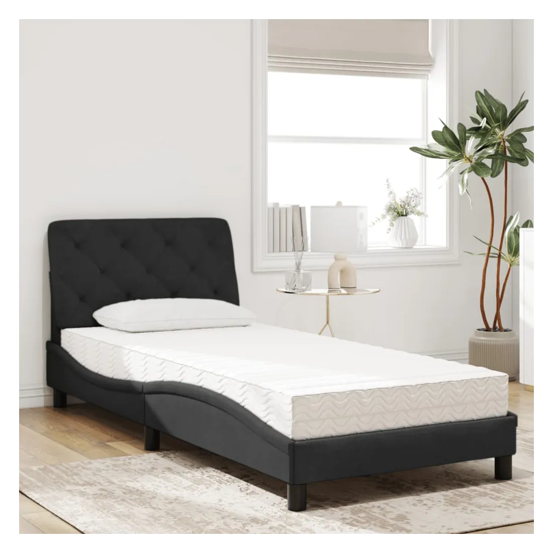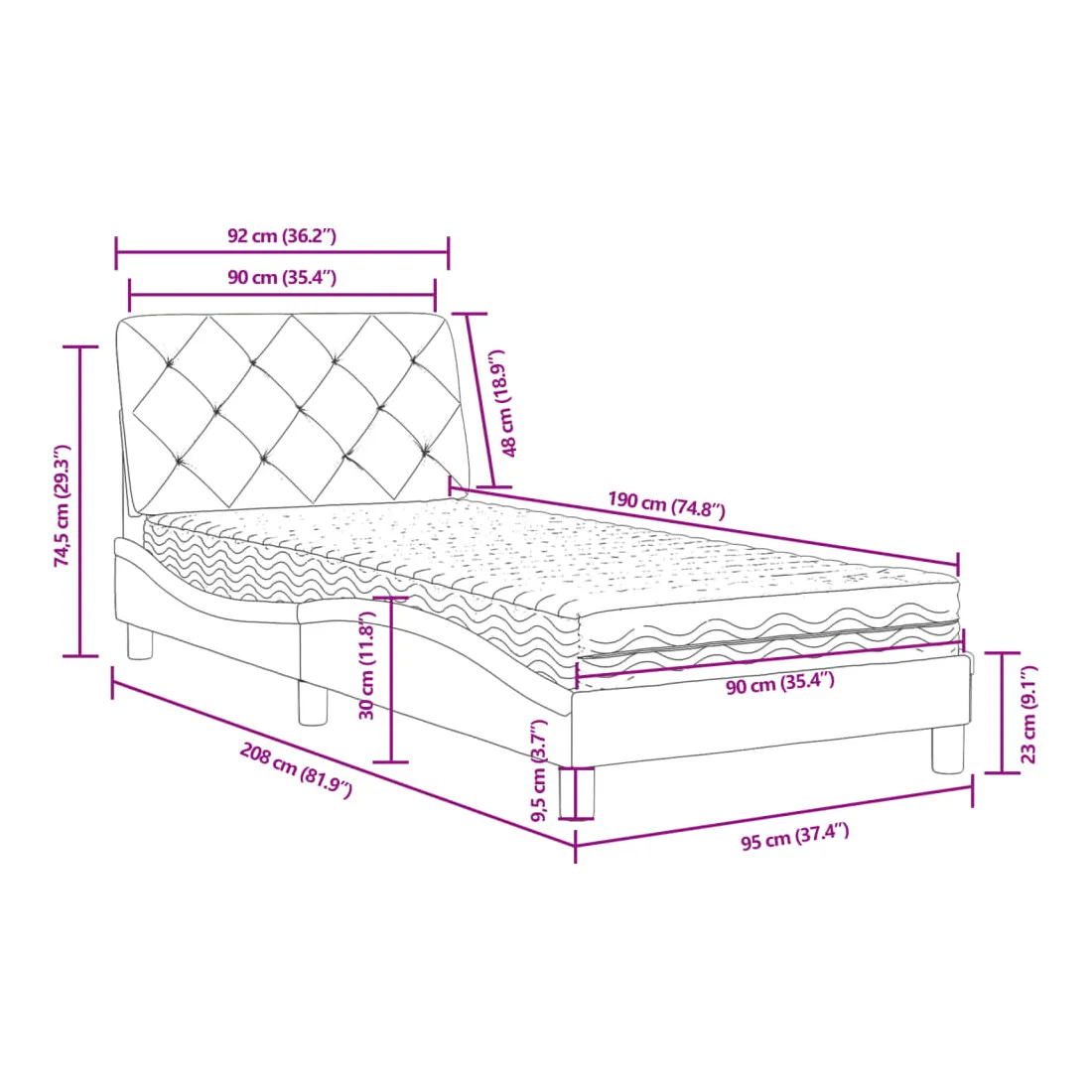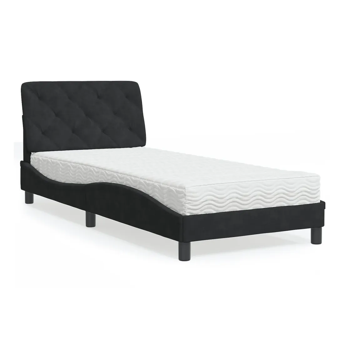 Obtenez une meilleure nuit de sommeil reposante grâce à ce lit avec matelas ! Il est un supplément accueillant à toute chambre à coucher. Velours doux : le velours est un tissu doux et confortable, agréable au toucher.Lattes de contreplaqué : les lattes de contreplaqué assurent une bonne répartition du poids, garantissant que le matelas reste en place à chaque torsion de votre corps pendant le sommeil.Excellent soutien : la tête de lit vous offre un excellent soutien du dos lorsque vous êtes assis dans votre lit pour lire ou regarder la télévision.Matelas en mousse : ce matelas de lit en tissu à 3 couches est rempli de mousse PU 22D pour un confort optimal. Il contribue à soulager la fatigue et à favoriser la circulation sanguine, vous offrant ainsi une relaxation complète et une bonne qualité de sommeil. En outre, le matelas est disponible en dureté H2 et H3, de sorte que vous pouvez simplement tourner le matelas pour choisir la dureté qui vous convient le mieux.Design latéral ondulé : l’aspect ondulé du cadre de lit est élégant et sophistiqué, ajoutant une touche moderne et élégante à votre décor, ce qui en fait le point central de votre chambre à coucher.
