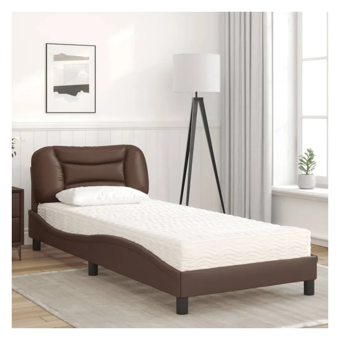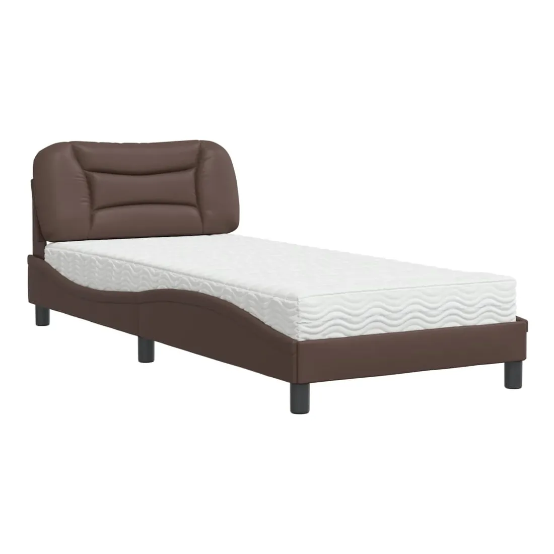 Obtenez une meilleure nuit de sommeil reposante grâce à ce lit avec matelas ! Il est un supplément accueillant à toute chambre à coucher. Similicuir durable : le similicuir de qualité supérieure est un matériau très durable. Il est résistant aux taches, ce qui le rend facile à nettoyer avec un chiffon humide. La surface lisse donne également un aspect luxueux et la beauté du cuir véritable.Lattes de contreplaqué : les lattes de contreplaqué assurent une bonne répartition du poids, garantissant que le matelas reste en place à chaque torsion de votre corps pendant le sommeil.Excellent soutien : la tête de lit vous offre un excellent soutien du dos lorsque vous êtes assis dans votre lit pour lire ou regarder la télévision.Matelas en mousse : ce matelas de lit en tissu à 3 couches est rempli de mousse PU 22D pour un confort optimal. Il contribue à soulager la fatigue et à favoriser la circulation sanguine, vous offrant ainsi une relaxation complète et une bonne qualité de sommeil. En outre, le matelas est disponible en dureté H2 et H3, de sorte que vous pouvez simplement tourner le matelas pour choisir la dureté qui vous convient le mieux.Design latéral ondulé : l’aspect ondulé du cadre de lit est élégant et sophistiqué, ajoutant une touche moderne et élégante à votre décor, ce qui en fait le point central de votre chambre à coucher.