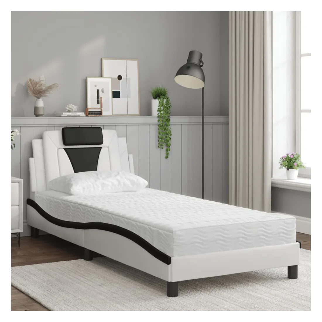 Obtenez une meilleure nuit de sommeil reposante grâce à ce lit avec matelas ! Il est un supplément accueillant à toute chambre à coucher. Similicuir durable : le similicuir de qualité supérieure est un matériau très durable. Il est résistant aux taches, ce qui le rend facile à nettoyer avec un chiffon humide. La surface lisse donne également un aspect luxueux et la beauté du cuir véritable. Lattes de contreplaqué : les lattes de contreplaqué assurent une bonne répartition du poids, garantissant que le matelas reste en place à chaque torsion de votre corps pendant le sommeil. Excellent soutien : l'oreiller de tête de lit est rembourré avec de la mousse pour un confort ultra doux et optimal vous offre un excellent soutien du dos lorsque vous êtes assis dans votre lit pour lire ou regarder la télévision. Matelas en mousse : ce matelas de lit en tissu à 3 couches est rempli de mousse PU 22D pour un confort optimal. Il contribue à soulager la fatigue et à favoriser la circulation sanguine, vous offrant ainsi une relaxation complète et une bonne qualité de sommeil. En outre, le matelas est disponible en dureté H2 et H3, de sorte que vous pouvez simplement tourner le matelas pour choisir la dureté qui vous convient le mieux. Design latéral ondulé : l’aspect ondulé du cadre de lit est élégant et sophistiqué, ajoutant une touche moderne et élégante à votre décor, ce qui en fait le point central de votre chambre à coucher.