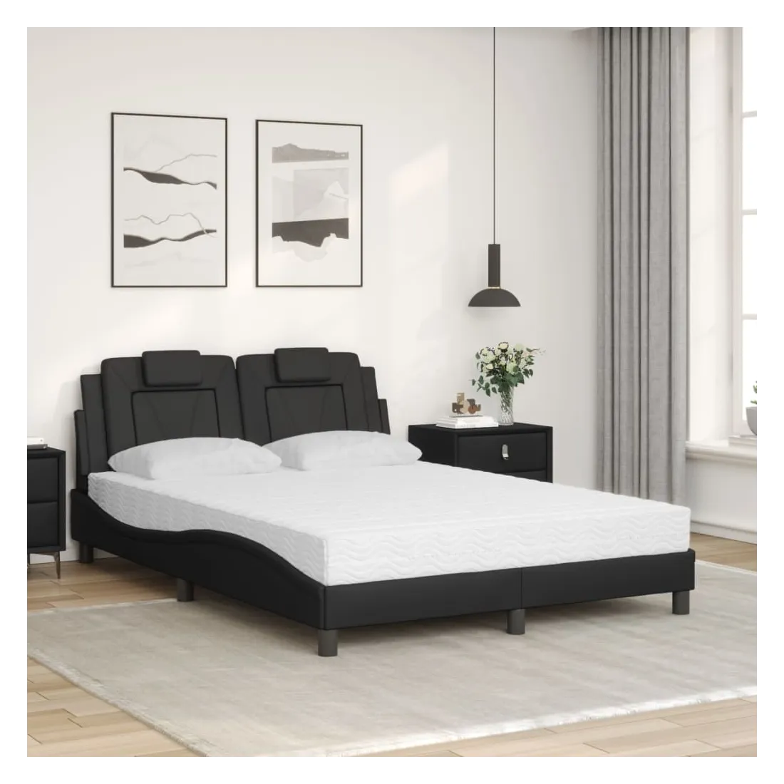 Obtenez une meilleure nuit de sommeil reposante grâce à ce lit avec matelas ! Il est un supplément accueillant à toute chambre à coucher. Similicuir durable : le similicuir de qualité supérieure est un matériau très durable. Il est résistant aux taches, ce qui le rend facile à nettoyer avec un chiffon humide. La surface lisse donne également un aspect luxueux et la beauté du cuir véritable. Lattes de contreplaqué : les lattes de contreplaqué assurent une bonne répartition du poids, garantissant que le matelas reste en place à chaque torsion de votre corps pendant le sommeil. Excellent soutien : l'oreiller de tête de lit est rembourré avec de la mousse pour un confort ultra doux et optimal vous offre un excellent soutien du dos lorsque vous êtes assis dans votre lit pour lire ou regarder la télévision. Matelas en mousse : ce matelas de lit en tissu à 3 couches est rempli de mousse PU 22D pour un confort optimal. Il contribue à soulager la fatigue et à favoriser la circulation sanguine, vous offrant ainsi une relaxation complète et une bonne qualité de sommeil. En outre, le matelas est disponible en dureté H2 et H3, de sorte que vous pouvez simplement tourner le matelas pour choisir la dureté qui vous convient le mieux. Design latéral ondulé : l’aspect ondulé du cadre de lit est élégant et sophistiqué, ajoutant une touche moderne et élégante à votre décor, ce qui en fait le point central de votre chambre à coucher.