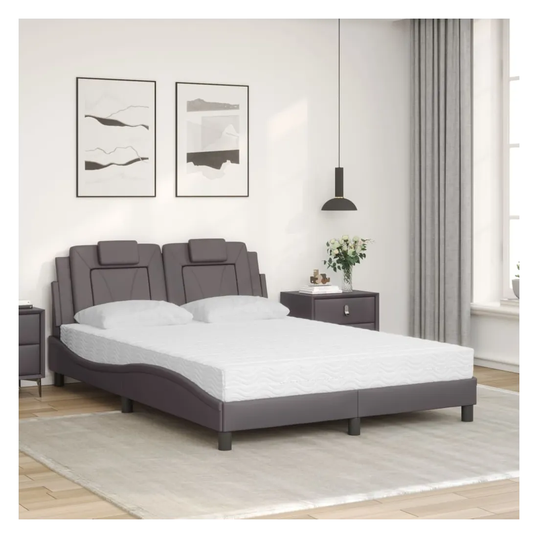 Obtenez une meilleure nuit de sommeil reposante grâce à ce lit avec matelas ! Il est un supplément accueillant à toute chambre à coucher. Similicuir durable : le similicuir de qualité supérieure est un matériau très durable. Il est résistant aux taches, ce qui le rend facile à nettoyer avec un chiffon humide. La surface lisse donne également un aspect luxueux et la beauté du cuir véritable. Lattes de contreplaqué : les lattes de contreplaqué assurent une bonne répartition du poids, garantissant que le matelas reste en place à chaque torsion de votre corps pendant le sommeil. Excellent soutien : l'oreiller de tête de lit est rembourré avec de la mousse pour un confort ultra doux et optimal vous offre un excellent soutien du dos lorsque vous êtes assis dans votre lit pour lire ou regarder la télévision. Matelas en mousse : ce matelas de lit en tissu à 3 couches est rempli de mousse PU 22D pour un confort optimal. Il contribue à soulager la fatigue et à favoriser la circulation sanguine, vous offrant ainsi une relaxation complète et une bonne qualité de sommeil. En outre, le matelas est disponible en dureté H2 et H3, de sorte que vous pouvez simplement tourner le matelas pour choisir la dureté qui vous convient le mieux. Design latéral ondulé : l’aspect ondulé du cadre de lit est élégant et sophistiqué, ajoutant une touche moderne et élégante à votre décor, ce qui en fait le point central de votre chambre à coucher.