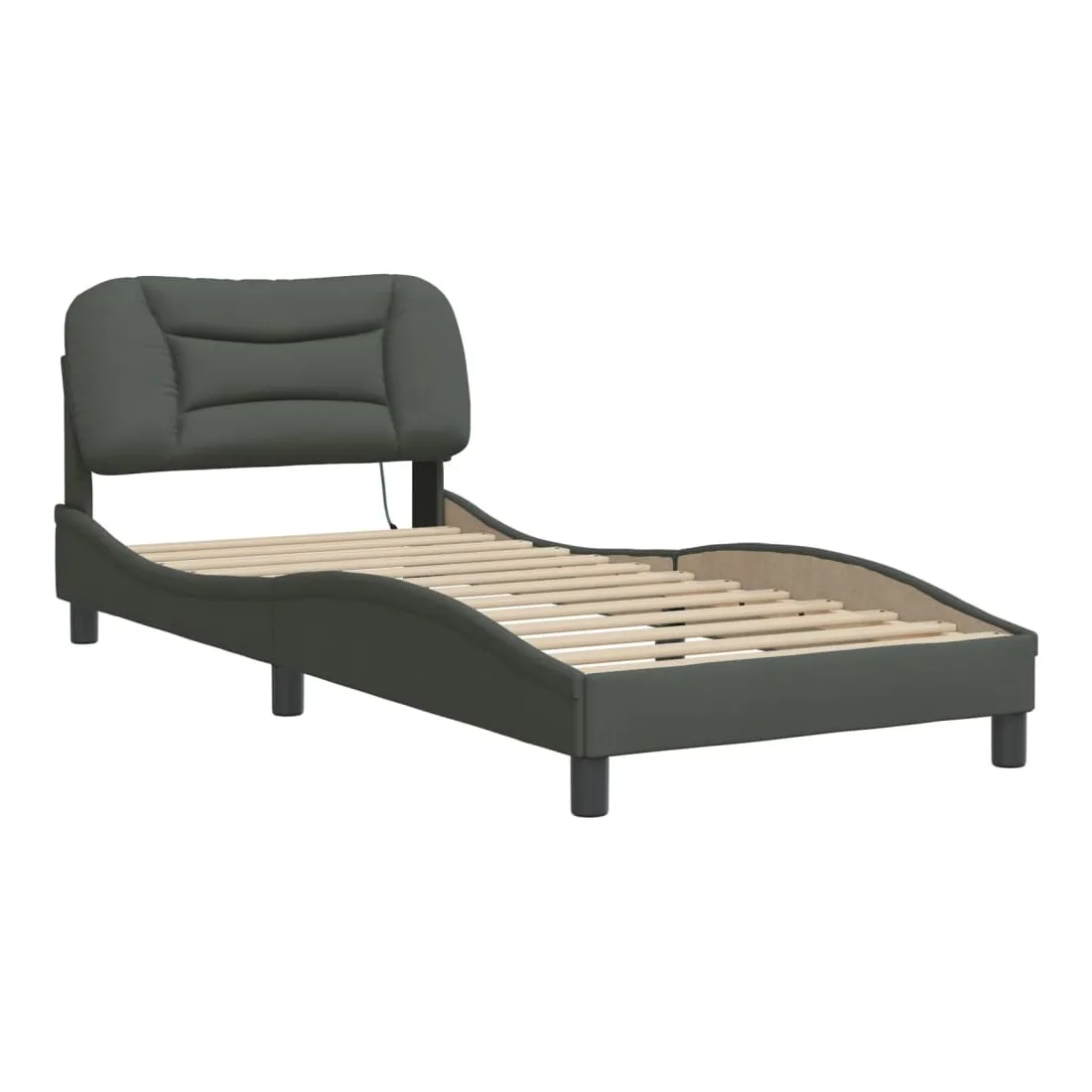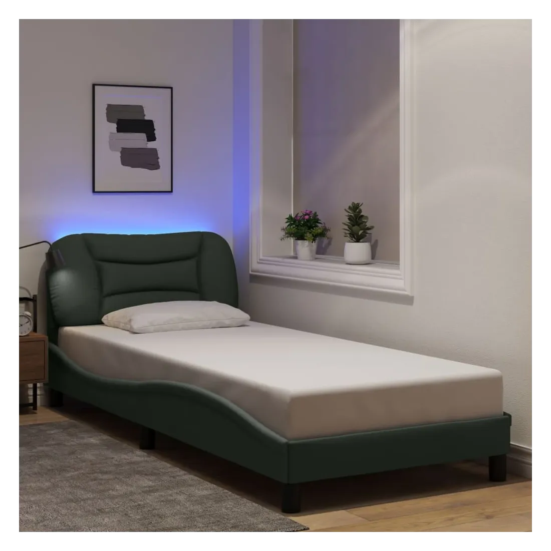 Obtenez une meilleure nuit de sommeil reposante grâce à ce cadre de lit avec lumières LED ! Il est un supplément accueillant à toute chambre à coucher. Tissu durable : le tissu présente un aspect simple et épuré, et il est respirant et durable.Lattes de contreplaqué : les lattes de contreplaqué assurent une bonne répartition du poids, garantissant que le matelas reste en place à chaque torsion de votre corps pendant le sommeil.Excellent soutien : la tête de lit vous offre un excellent soutien du dos lorsque vous êtes assis dans votre lit pour lire ou regarder la télévision.Bande LED colorée : apportez de la gaieté dans l'obscurité avec des lumières LED colorées ! Les bandes auto-agrippantes situées à l'arrière du coussin de la tête de lit peuvent être utilisées pour fixer les lumières LED.Design latéral ondulé : l’aspect ondulé du cadre de lit est élégant et sophistiqué, ajoutant une touche moderne et élégante à votre décor, ce qui en fait le point central de votre chambre à coucher. Bon à savoir :Un matelas n'est pas inclus avec ce lit. Nous offrons une sélection variée de matelas. Vous pouvez consulter notre boutique pour trouver un matelas assorti.Ce produit est doté d'un connecteur USB qui nécessite une source d'alimentation USB de 5V certifiée (non incluse).