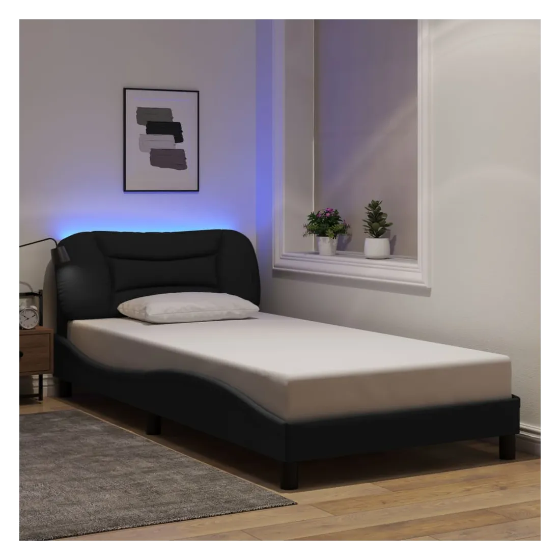 Obtenez une meilleure nuit de sommeil reposante grâce à ce cadre de lit avec lumières LED ! Il est un supplément accueillant à toute chambre à coucher. Tissu durable : le tissu présente un aspect simple et épuré, et il est respirant et durable.Lattes de contreplaqué : les lattes de contreplaqué assurent une bonne répartition du poids, garantissant que le matelas reste en place à chaque torsion de votre corps pendant le sommeil.Excellent soutien : la tête de lit vous offre un excellent soutien du dos lorsque vous êtes assis dans votre lit pour lire ou regarder la télévision.Bande LED colorée : apportez de la gaieté dans l'obscurité avec des lumières LED colorées ! Les bandes auto-agrippantes situées à l'arrière du coussin de la tête de lit peuvent être utilisées pour fixer les lumières LED.Design latéral ondulé : l’aspect ondulé du cadre de lit est élégant et sophistiqué, ajoutant une touche moderne et élégante à votre décor, ce qui en fait le point central de votre chambre à coucher. Bon à savoir :Un matelas n'est pas inclus avec ce lit. Nous offrons une sélection variée de matelas. Vous pouvez consulter notre boutique pour trouver un matelas assorti.Ce produit est doté d'un connecteur USB qui nécessite une source d'alimentation USB de 5V certifiée (non incluse).
