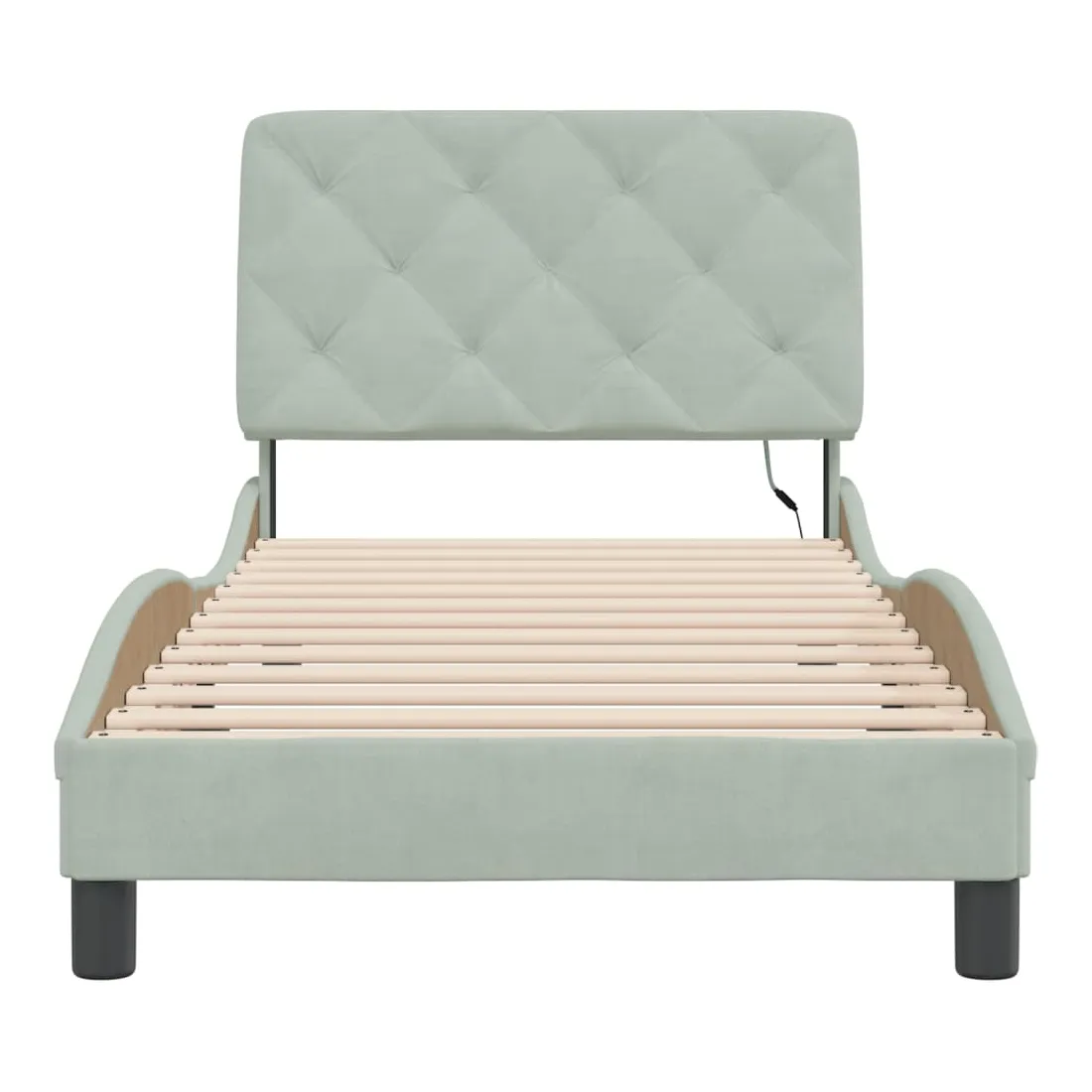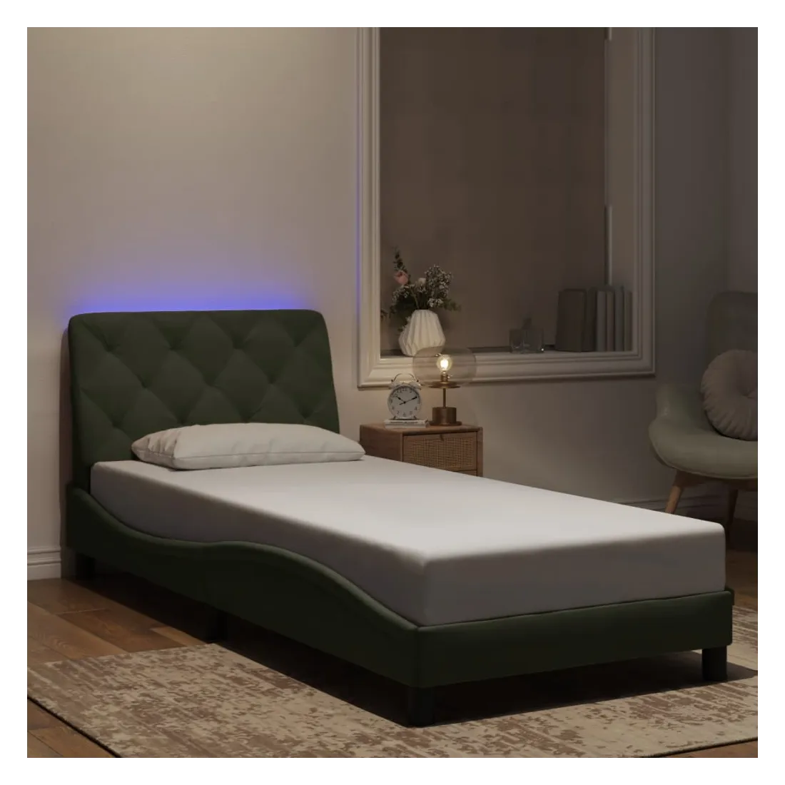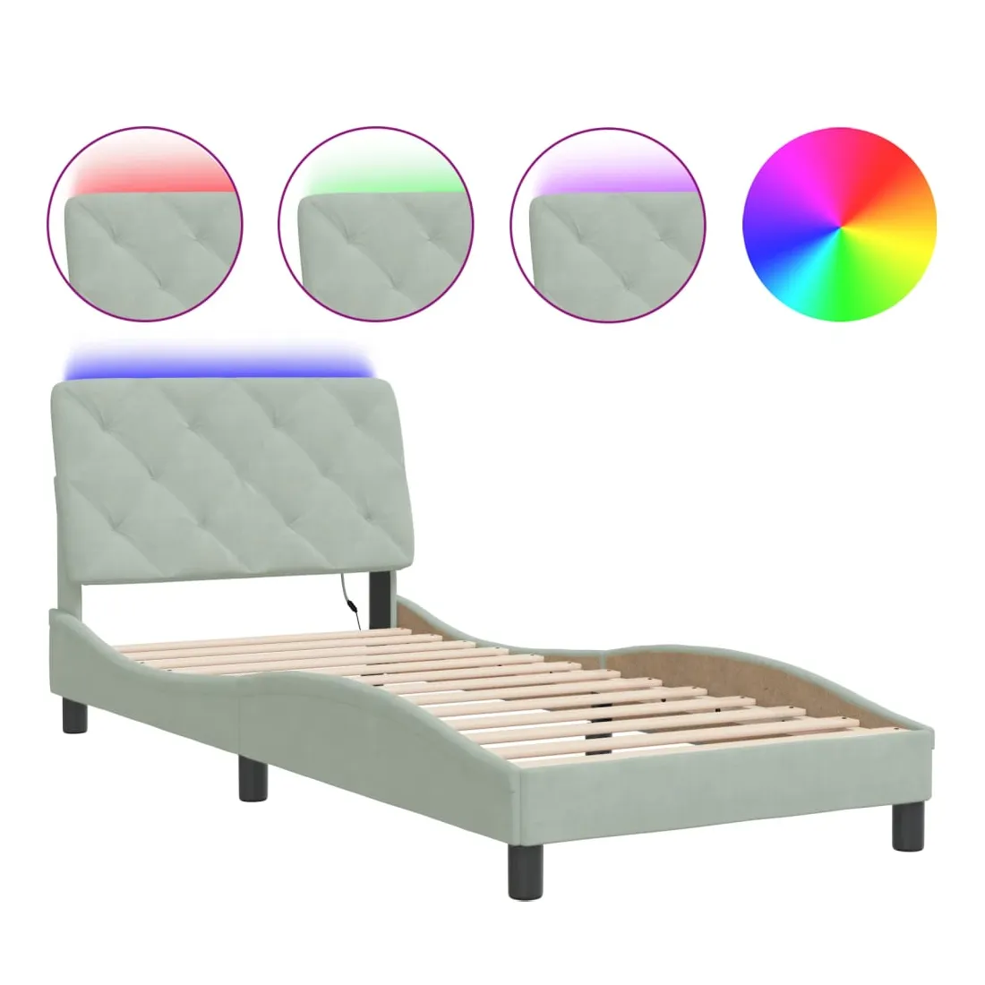 Obtenez une meilleure nuit de sommeil reposante grâce à ce cadre de lit avec lumières LED ! Il est un supplément accueillant à toute chambre à coucher. Velours doux : le velours est un tissu doux et confortable, agréable au toucher. Lattes de contreplaqué : les lattes de contreplaqué assurent une bonne répartition du poids, garantissant que le matelas reste en place à chaque torsion de votre corps pendant le sommeil. Excellent soutien : l'oreiller de tête de lit est rembourré avec de la mousse pour un confort ultra doux et optimal vous offre un excellent soutien du dos lorsque vous êtes assis dans votre lit pour lire ou regarder la télévision. Bande LED colorée : apportez de la gaieté dans l'obscurité avec des lumières LED colorées ! Les bandes auto-agrippantes situées à l'arrière du coussin de la tête de lit peuvent être utilisées pour fixer les lumières LED. Design latéral ondulé : l’aspect ondulé du cadre de lit est élégant et sophistiqué, ajoutant une touche moderne et élégante à votre décor, ce qui en fait le point central de votre chambre à coucher. Bon à savoir :Un matelas n'est pas inclus avec ce lit. Nous offrons une sélection variée de matelas. Vous pouvez consulter notre boutique pour trouver un matelas assorti.Ce produit est doté d'un connecteur USB qui nécessite une source d'alimentation USB de 5V certifiée (non incluse).