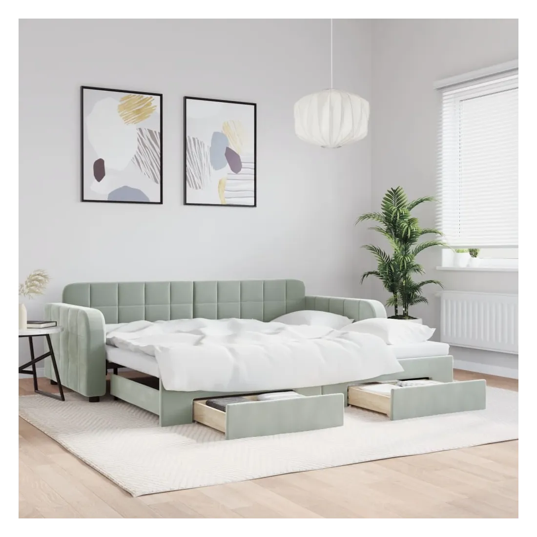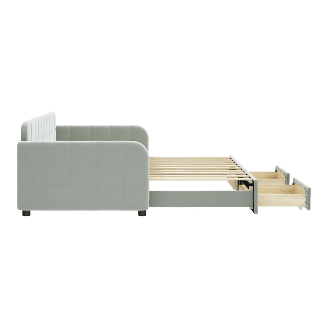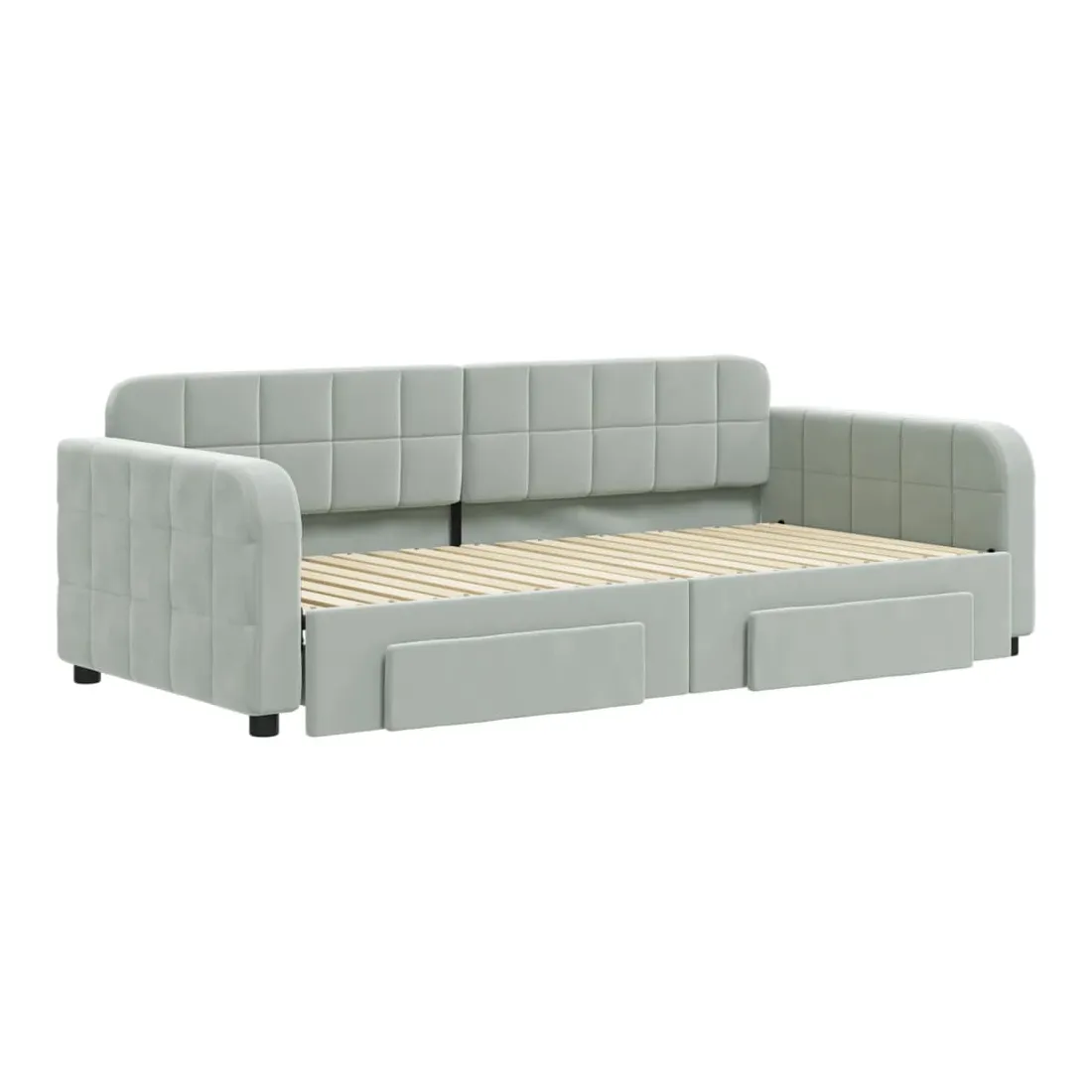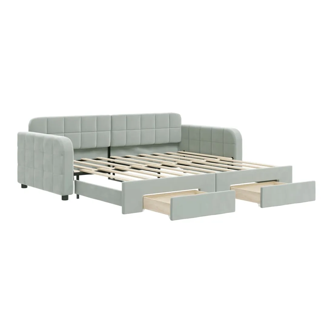 Ce lit de repos 2 en 1 avec lit gigogne, servant à la fois de canapé et de lit, constitue un supplément pratique et accrocheur à votre salon ou chambre à coucher. Lit de repos polyvalent : le canapé-lit fonctionne comme un canapé pendant la journée et se transforme facilement en lit double la nuit en retirant le lit gigogne, offrant une solution pratique pour accueillir des invités et maximiser l'espace. Grand espace de rangement : ce lit d'appoint dispose de deux tiroirs à roulettes qui offrent suffisamment d'espace pour ranger vos vêtements, chaussettes, jouets, coussins, etc.Velours doux et construction solide : ce canapé-lit a un cadre robuste en bois et en métal et est recouvert de velours doux et confortable. Bon à savoir :Les matelas ne sont pas inclus avec ce lit. Nous proposons une sélection variée de matelas. Vous pouvez consulter notre boutique pour trouver les matelas assortis.