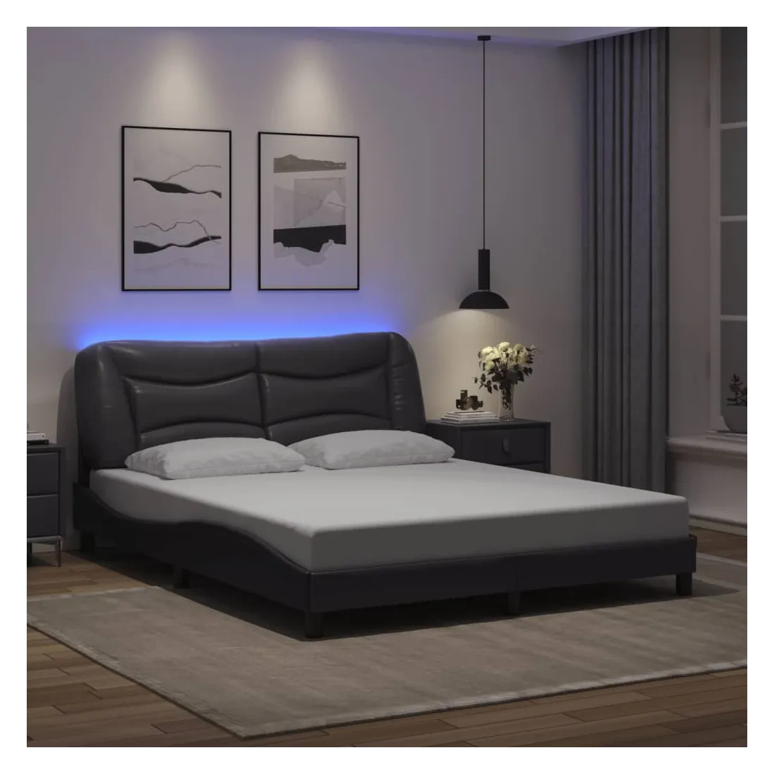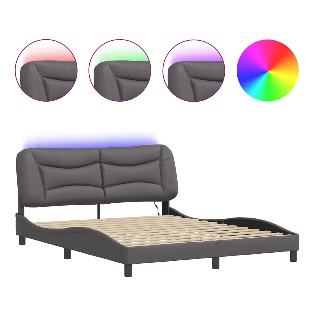 Obtenez une meilleure nuit de sommeil reposante grâce à ce cadre de lit avec lumières LED ! Il est un supplément accueillant à toute chambre à coucher. Similicuir durable : le similicuir de qualité supérieure est un matériau très durable. Il est résistant aux taches, ce qui le rend facile à nettoyer avec un chiffon humide. La surface lisse donne également un aspect luxueux et la beauté du cuir véritable.Lattes de contreplaqué : les lattes de contreplaqué assurent une bonne répartition du poids, garantissant que le matelas reste en place à chaque torsion de votre corps pendant le sommeil.Excellent soutien : la tête de lit vous offre un excellent soutien du dos lorsque vous êtes assis dans votre lit pour lire ou regarder la télévision.Bande LED colorée : apportez de la gaieté dans l'obscurité avec des lumières LED colorées ! Les bandes auto-agrippantes situées à l'arrière du coussin de la tête de lit peuvent être utilisées pour fixer les lumières LED.Design latéral ondulé : l’aspect ondulé du cadre de lit est élégant et sophistiqué, ajoutant une touche moderne et élégante à votre décor, ce qui en fait le point central de votre chambre à coucher. Bon à savoir :Un matelas n'est pas inclus avec ce lit. Nous offrons une sélection variée de matelas. Vous pouvez consulter notre boutique pour trouver un matelas assorti.Ce produit est doté d'un connecteur USB qui nécessite une source d'alimentation USB de 5V certifiée (non incluse).