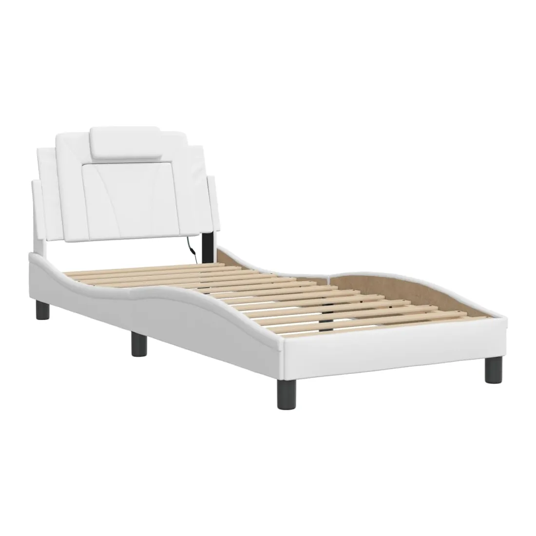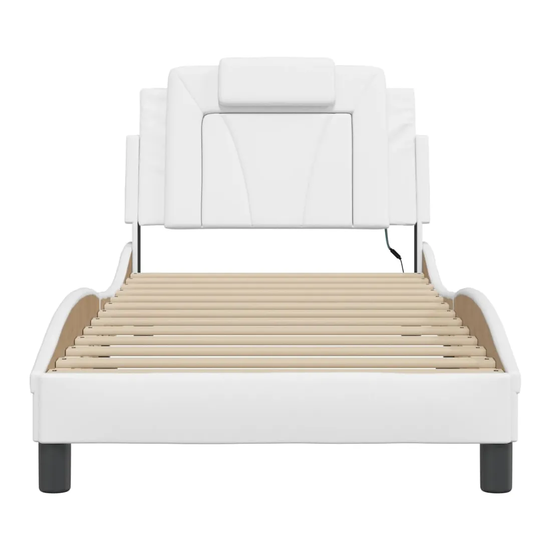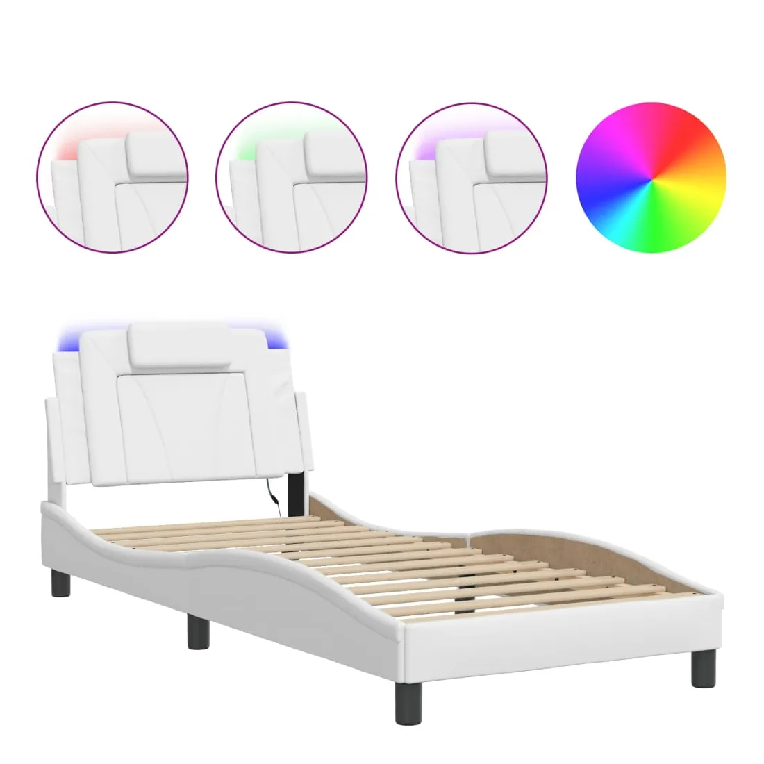 Obtenez une meilleure nuit de sommeil reposante grâce à ce cadre de lit avec lumières LED ! Il est un supplément accueillant à toute chambre à coucher. Similicuir durable : le similicuir de qualité supérieure est un matériau très durable. Il est résistant aux taches, ce qui le rend facile à nettoyer avec un chiffon humide. La surface lisse donne également un aspect luxueux et la beauté du cuir véritable.Lattes de contreplaqué : les lattes de contreplaqué assurent une bonne répartition du poids, garantissant que le matelas reste en place à chaque torsion de votre corps pendant le sommeil. Excellent soutien : l'oreiller de tête de lit est rembourré avec de la mousse pour un confort ultra doux et optimal vous offre un excellent soutien du dos lorsque vous êtes assis dans votre lit pour lire ou regarder la télévision. Bande LED colorée : apportez de la gaieté dans l'obscurité avec des lumières LED colorées ! Les bandes auto-agrippantes situées à l'arrière du coussin de la tête de lit peuvent être utilisées pour fixer les lumières LED. Design latéral ondulé : l’aspect ondulé du cadre de lit est élégant et sophistiqué, ajoutant une touche moderne et élégante à votre décor, ce qui en fait le point central de votre chambre à coucher. Bon à savoir :Un matelas n'est pas inclus avec ce lit. Nous offrons une sélection variée de matelas. Vous pouvez consulter notre boutique pour trouver un matelas assorti.Ce produit est doté d'un connecteur USB qui nécessite une source d'alimentation USB de 5V certifiée (non incluse).