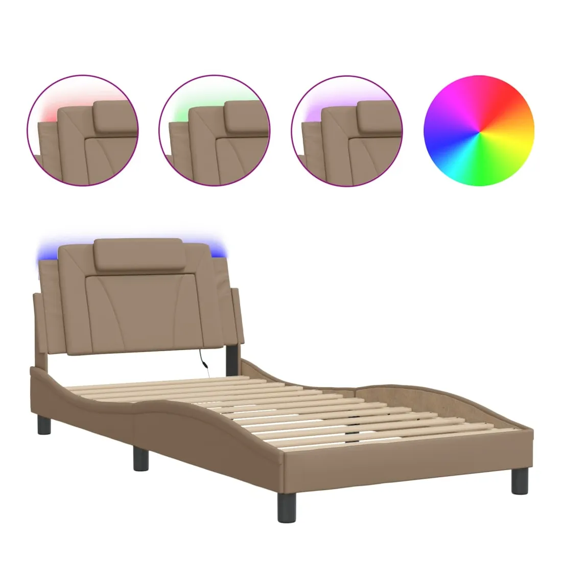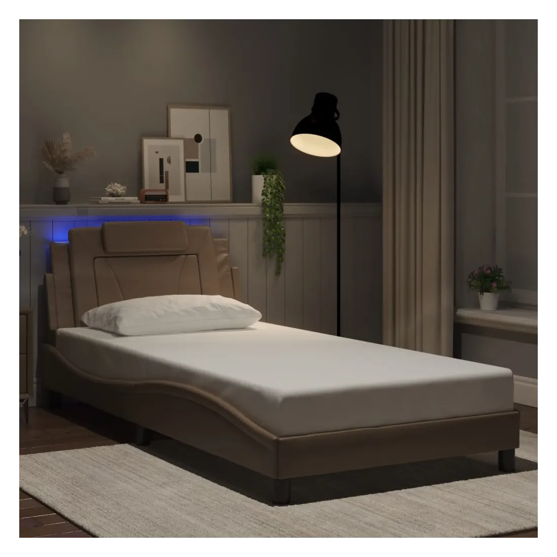 Obtenez une meilleure nuit de sommeil reposante grâce à ce cadre de lit avec lumières LED ! Il est un supplément accueillant à toute chambre à coucher. Similicuir durable : le similicuir de qualité supérieure est un matériau très durable. Il est résistant aux taches, ce qui le rend facile à nettoyer avec un chiffon humide. La surface lisse donne également un aspect luxueux et la beauté du cuir véritable.Lattes de contreplaqué : les lattes de contreplaqué assurent une bonne répartition du poids, garantissant que le matelas reste en place à chaque torsion de votre corps pendant le sommeil. Excellent soutien : l'oreiller de tête de lit est rembourré avec de la mousse pour un confort ultra doux et optimal vous offre un excellent soutien du dos lorsque vous êtes assis dans votre lit pour lire ou regarder la télévision. Bande LED colorée : apportez de la gaieté dans l'obscurité avec des lumières LED colorées ! Les bandes auto-agrippantes situées à l'arrière du coussin de la tête de lit peuvent être utilisées pour fixer les lumières LED. Design latéral ondulé : l’aspect ondulé du cadre de lit est élégant et sophistiqué, ajoutant une touche moderne et élégante à votre décor, ce qui en fait le point central de votre chambre à coucher. Bon à savoir :Un matelas n'est pas inclus avec ce lit. Nous offrons une sélection variée de matelas. Vous pouvez consulter notre boutique pour trouver un matelas assorti.Ce produit est doté d'un connecteur USB qui nécessite une source d'alimentation USB de 5V certifiée (non incluse).