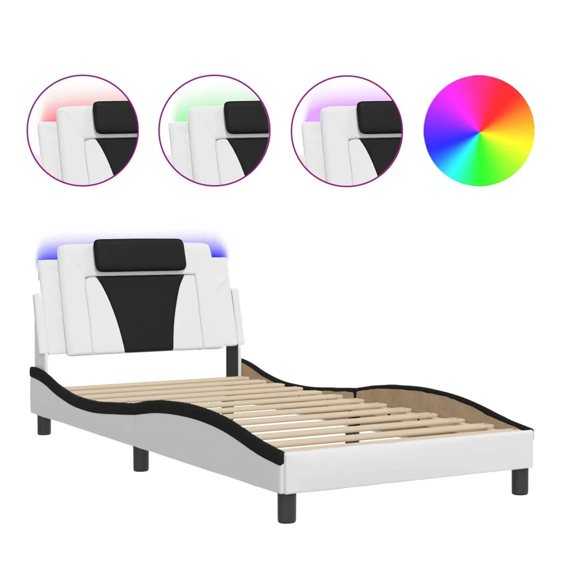 Obtenez une meilleure nuit de sommeil reposante grâce à ce cadre de lit avec lumières LED ! Il est un supplément accueillant à toute chambre à coucher. Similicuir durable : le similicuir de qualité supérieure est un matériau très durable. Il est résistant aux taches, ce qui le rend facile à nettoyer avec un chiffon humide. La surface lisse donne également un aspect luxueux et la beauté du cuir véritable.Lattes de contreplaqué : les lattes de contreplaqué assurent une bonne répartition du poids, garantissant que le matelas reste en place à chaque torsion de votre corps pendant le sommeil. Excellent soutien : l'oreiller de tête de lit est rembourré avec de la mousse pour un confort ultra doux et optimal vous offre un excellent soutien du dos lorsque vous êtes assis dans votre lit pour lire ou regarder la télévision. Bande LED colorée : apportez de la gaieté dans l'obscurité avec des lumières LED colorées ! Les bandes auto-agrippantes situées à l'arrière du coussin de la tête de lit peuvent être utilisées pour fixer les lumières LED. Design latéral ondulé : l’aspect ondulé du cadre de lit est élégant et sophistiqué, ajoutant une touche moderne et élégante à votre décor, ce qui en fait le point central de votre chambre à coucher. Bon à savoir :Un matelas n'est pas inclus avec ce lit. Nous offrons une sélection variée de matelas. Vous pouvez consulter notre boutique pour trouver un matelas assorti.Ce produit est doté d'un connecteur USB qui nécessite une source d'alimentation USB de 5V certifiée (non incluse).