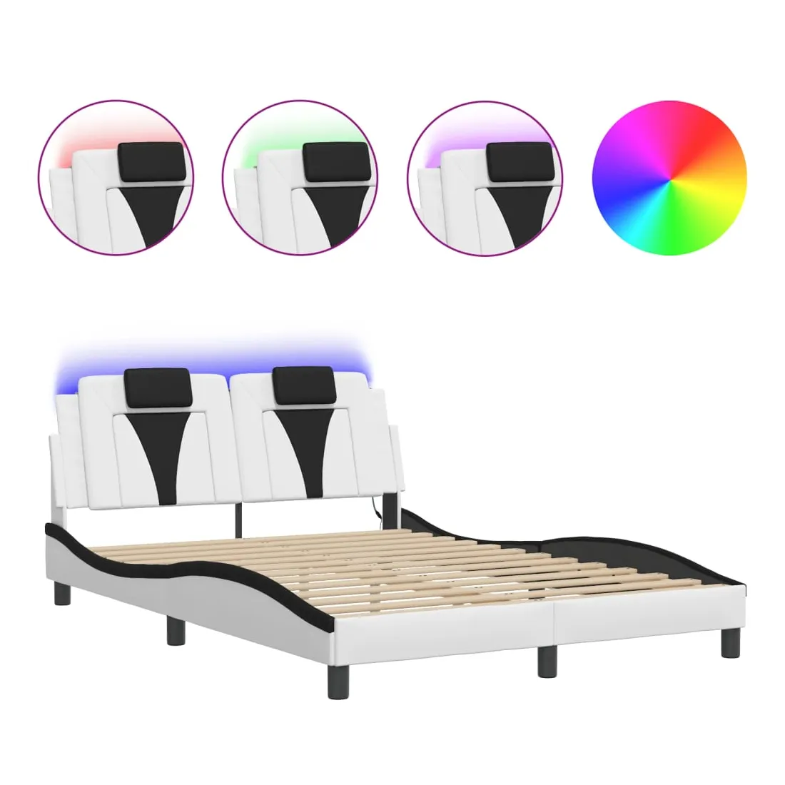 Obtenez une meilleure nuit de sommeil reposante grâce à ce cadre de lit avec lumières LED ! Il est un supplément accueillant à toute chambre à coucher. Similicuir durable : le similicuir de qualité supérieure est un matériau très durable. Il est résistant aux taches, ce qui le rend facile à nettoyer avec un chiffon humide. La surface lisse donne également un aspect luxueux et la beauté du cuir véritable.Lattes de contreplaqué : les lattes de contreplaqué assurent une bonne répartition du poids, garantissant que le matelas reste en place à chaque torsion de votre corps pendant le sommeil. Excellent soutien : l'oreiller de tête de lit est rembourré avec de la mousse pour un confort ultra doux et optimal vous offre un excellent soutien du dos lorsque vous êtes assis dans votre lit pour lire ou regarder la télévision. Bande LED colorée : apportez de la gaieté dans l'obscurité avec des lumières LED colorées ! Les bandes auto-agrippantes situées à l'arrière du coussin de la tête de lit peuvent être utilisées pour fixer les lumières LED. Design latéral ondulé : l’aspect ondulé du cadre de lit est élégant et sophistiqué, ajoutant une touche moderne et élégante à votre décor, ce qui en fait le point central de votre chambre à coucher. Bon à savoir :Un matelas n'est pas inclus avec ce lit. Nous offrons une sélection variée de matelas. Vous pouvez consulter notre boutique pour trouver un matelas assorti.Ce produit est doté d'un connecteur USB qui nécessite une source d'alimentation USB de 5V certifiée (non incluse).