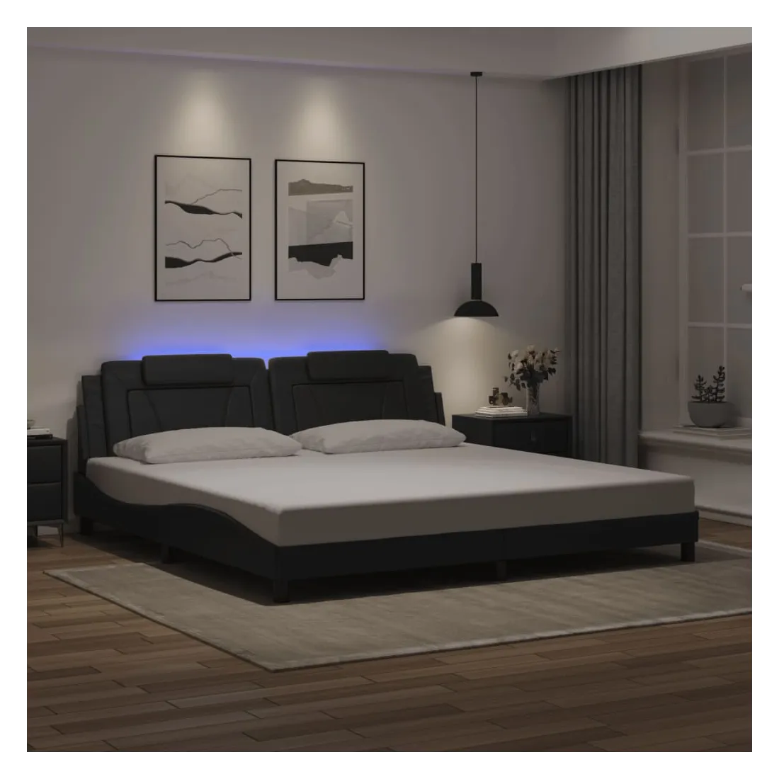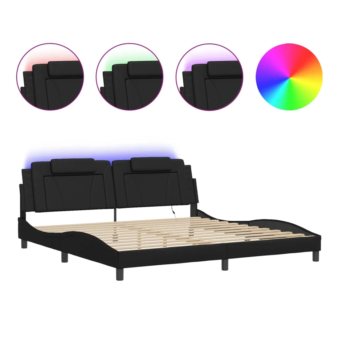 Obtenez une meilleure nuit de sommeil reposante grâce à ce cadre de lit avec lumières LED ! Il est un supplément accueillant à toute chambre à coucher. Similicuir durable : le similicuir de qualité supérieure est un matériau très durable. Il est résistant aux taches, ce qui le rend facile à nettoyer avec un chiffon humide. La surface lisse donne également un aspect luxueux et la beauté du cuir véritable.Lattes de contreplaqué : les lattes de contreplaqué assurent une bonne répartition du poids, garantissant que le matelas reste en place à chaque torsion de votre corps pendant le sommeil. Excellent soutien : l'oreiller de tête de lit est rembourré avec de la mousse pour un confort ultra doux et optimal vous offre un excellent soutien du dos lorsque vous êtes assis dans votre lit pour lire ou regarder la télévision. Bande LED colorée : apportez de la gaieté dans l'obscurité avec des lumières LED colorées ! Les bandes auto-agrippantes situées à l'arrière du coussin de la tête de lit peuvent être utilisées pour fixer les lumières LED. Design latéral ondulé : l’aspect ondulé du cadre de lit est élégant et sophistiqué, ajoutant une touche moderne et élégante à votre décor, ce qui en fait le point central de votre chambre à coucher. Bon à savoir :Un matelas n'est pas inclus avec ce lit. Nous offrons une sélection variée de matelas. Vous pouvez consulter notre boutique pour trouver un matelas assorti.Ce produit est doté d'un connecteur USB qui nécessite une source d'alimentation USB de 5V certifiée (non incluse).