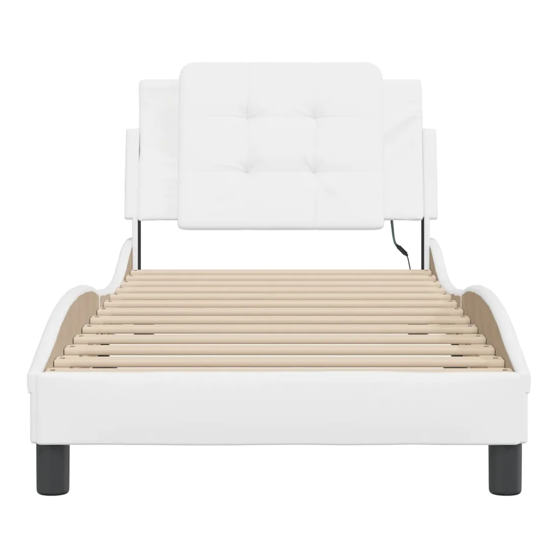 Obtenez une meilleure nuit de sommeil reposante grâce à ce cadre de lit avec lumières LED ! Il est un supplément accueillant à toute chambre à coucher. Similicuir durable : le similicuir de qualité supérieure est un matériau très durable. Il est résistant aux taches, ce qui le rend facile à nettoyer avec un chiffon humide. La surface lisse donne également un aspect luxueux et la beauté du cuir véritable.Lattes de contreplaqué : les lattes de contreplaqué assurent une bonne répartition du poids, garantissant que le matelas reste en place à chaque torsion de votre corps pendant le sommeil.Excellent soutien : la tête de lit vous offre un excellent soutien du dos lorsque vous êtes assis dans votre lit pour lire ou regarder la télévision.Bande LED colorée : apportez de la gaieté dans l'obscurité avec des lumières LED colorées ! Les bandes auto-agrippantes situées à l'arrière du coussin de la tête de lit peuvent être utilisées pour fixer les lumières LED.Design latéral ondulé : l’aspect ondulé du cadre de lit est élégant et sophistiqué, ajoutant une touche moderne et élégante à votre décor, ce qui en fait le point central de votre chambre à coucher. Bon à savoir :Un matelas n'est pas inclus avec ce lit. Nous offrons une sélection variée de matelas. Vous pouvez consulter notre boutique pour trouver un matelas assorti.Ce produit est doté d'un connecteur USB qui nécessite une source d'alimentation USB de 5V certifiée (non incluse).