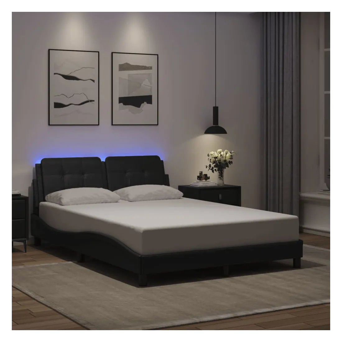 Obtenez une meilleure nuit de sommeil reposante grâce à ce cadre de lit avec lumières LED ! Il est un supplément accueillant à toute chambre à coucher. Similicuir durable : le similicuir de qualité supérieure est un matériau très durable. Il est résistant aux taches, ce qui le rend facile à nettoyer avec un chiffon humide. La surface lisse donne également un aspect luxueux et la beauté du cuir véritable.Lattes de contreplaqué : les lattes de contreplaqué assurent une bonne répartition du poids, garantissant que le matelas reste en place à chaque torsion de votre corps pendant le sommeil.Excellent soutien : la tête de lit vous offre un excellent soutien du dos lorsque vous êtes assis dans votre lit pour lire ou regarder la télévision.Bande LED colorée : apportez de la gaieté dans l'obscurité avec des lumières LED colorées ! Les bandes auto-agrippantes situées à l'arrière du coussin de la tête de lit peuvent être utilisées pour fixer les lumières LED.Design latéral ondulé : l’aspect ondulé du cadre de lit est élégant et sophistiqué, ajoutant une touche moderne et élégante à votre décor, ce qui en fait le point central de votre chambre à coucher. Bon à savoir :Un matelas n'est pas inclus avec ce lit. Nous offrons une sélection variée de matelas. Vous pouvez consulter notre boutique pour trouver un matelas assorti.Ce produit est doté d'un connecteur USB qui nécessite une source d'alimentation USB de 5V certifiée (non incluse).