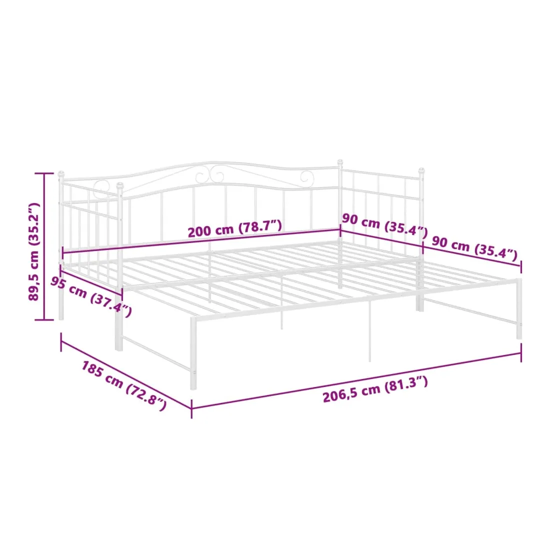 - Dimensions du lit (lorsqu'il n'est pas étendu) : 206,5 x 95 x 89,5 cm (L x l x H)