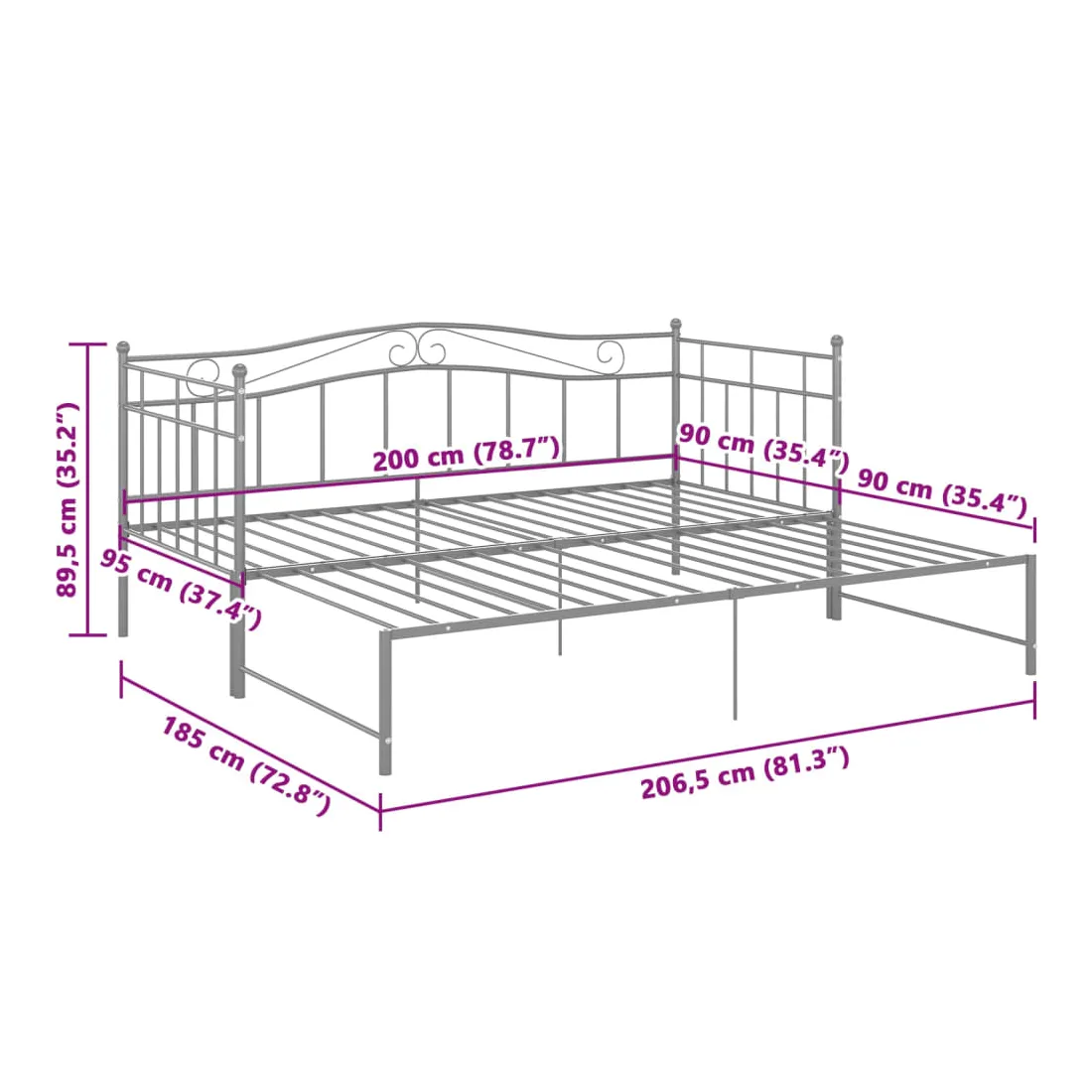 • Dimensions du lit (lorsqu'il n'est pas étendu) : 206,5 x 95 x 89,5 cm (L x l x H)