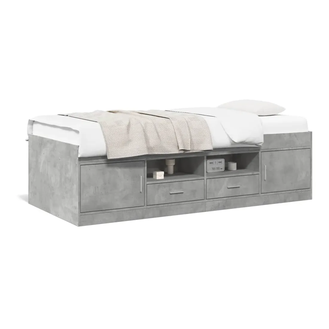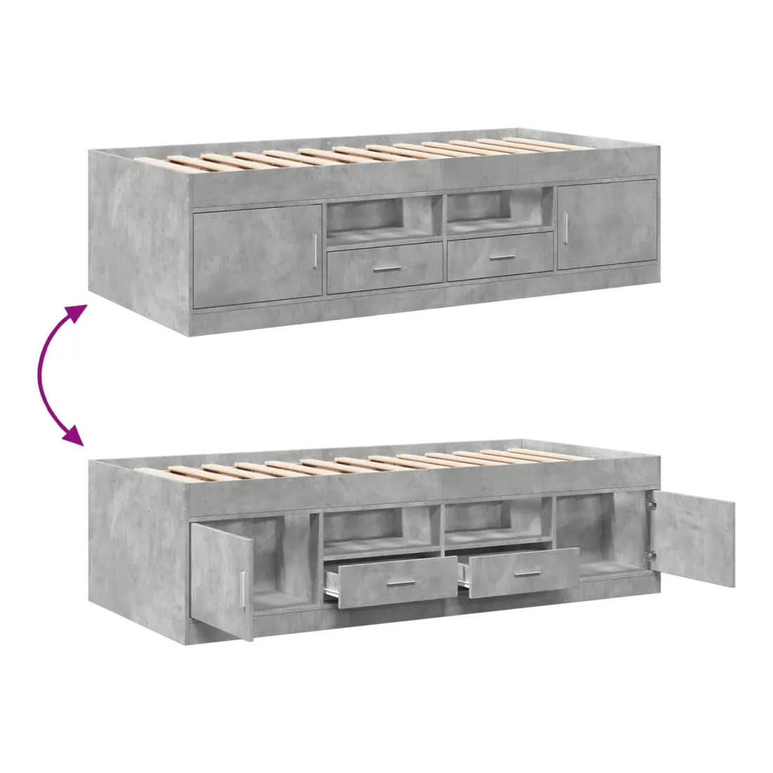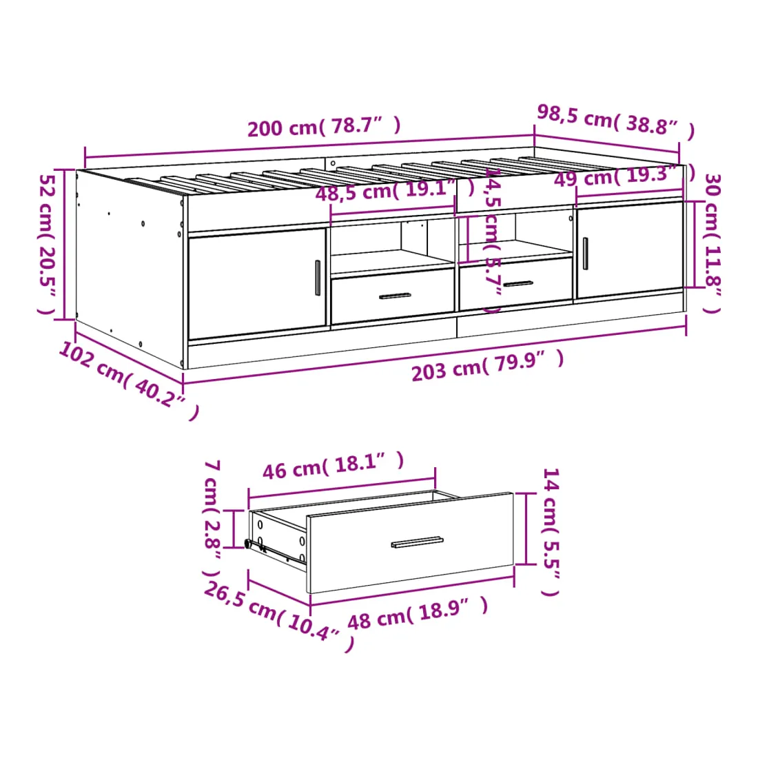 Ce lit de jour polyvalent peut être utilisé non seulement comme lit dans la chambre à coucher, mais aussi comme canapé dans le salon. Il conviendra parfaitement à vos différents besoins, vous offrant beaucoup d'espace pour dormir ou vous reposer. Construction solide : ce canapé-lit est doté d'un cadre robuste en bois d'ingénierie. Le bois d'ingénierie est d'une qualité exceptionnelle avec une surface lisse et se caractérise par sa solidité, sa stabilité et sa résistance à l'humidité.Fonction de rangement : les tiroirs de lit inclus offrent suffisamment d'espace de rangement pour ranger vos articles essentiels, gardant votre pièce propre et bien rangée.Lattes robustes : les lattes de contreplaqué assurent une bonne répartition du poids, garantissant que le matelas reste en place à chaque torsion de votre corps pendant le sommeil. Bon à savoir :Un matelas n'est pas inclus avec ce lit. Nous offrons une sélection variée de matelas. Vous pouvez consulter notre boutique pour trouver un matelas assorti.