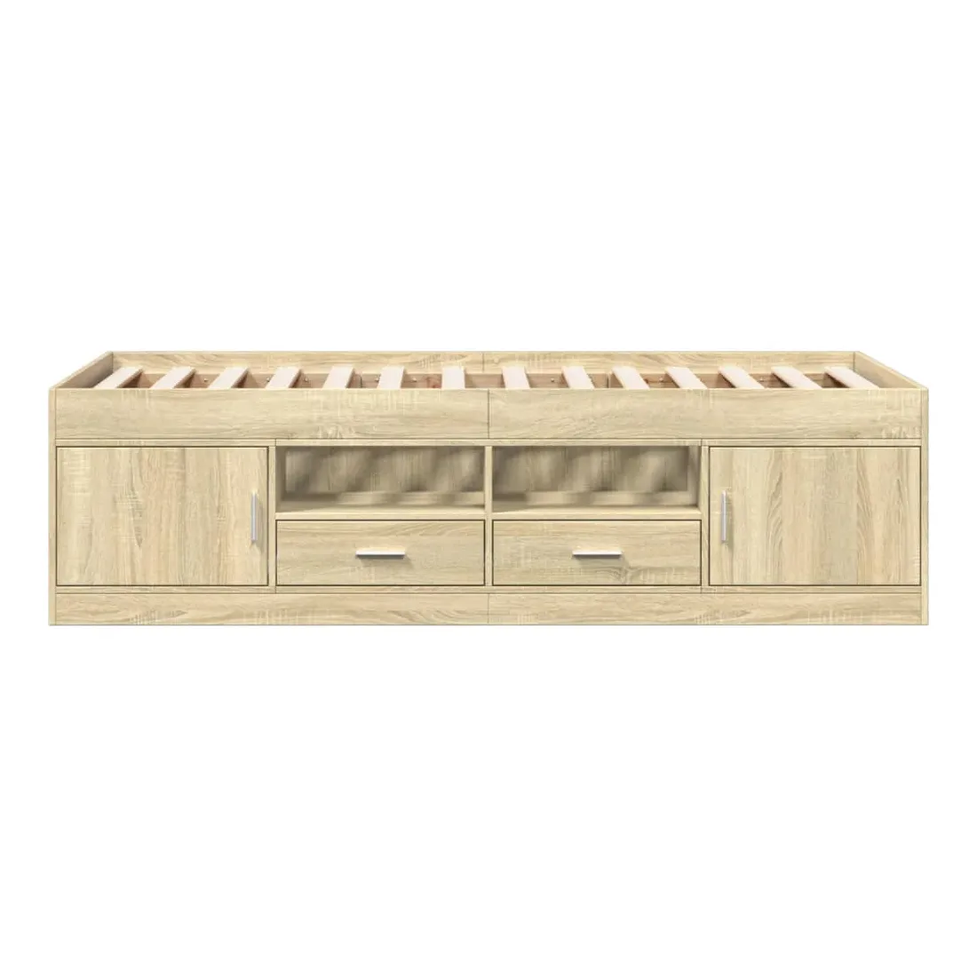 Ce lit de jour polyvalent peut être utilisé non seulement comme lit dans la chambre à coucher, mais aussi comme canapé dans le salon. Il conviendra parfaitement à vos différents besoins, vous offrant beaucoup d'espace pour dormir ou vous reposer. Construction solide : ce canapé-lit est doté d'un cadre robuste en bois d'ingénierie. Le bois d'ingénierie est d'une qualité exceptionnelle avec une surface lisse et se caractérise par sa solidité, sa stabilité et sa résistance à l'humidité.Fonction de rangement : les tiroirs de lit inclus offrent suffisamment d'espace de rangement pour ranger vos articles essentiels, gardant votre pièce propre et bien rangée.Lattes robustes : les lattes de contreplaqué assurent une bonne répartition du poids, garantissant que le matelas reste en place à chaque torsion de votre corps pendant le sommeil. Bon à savoir :Un matelas n'est pas inclus avec ce lit. Nous offrons une sélection variée de matelas. Vous pouvez consulter notre boutique pour trouver un matelas assorti.