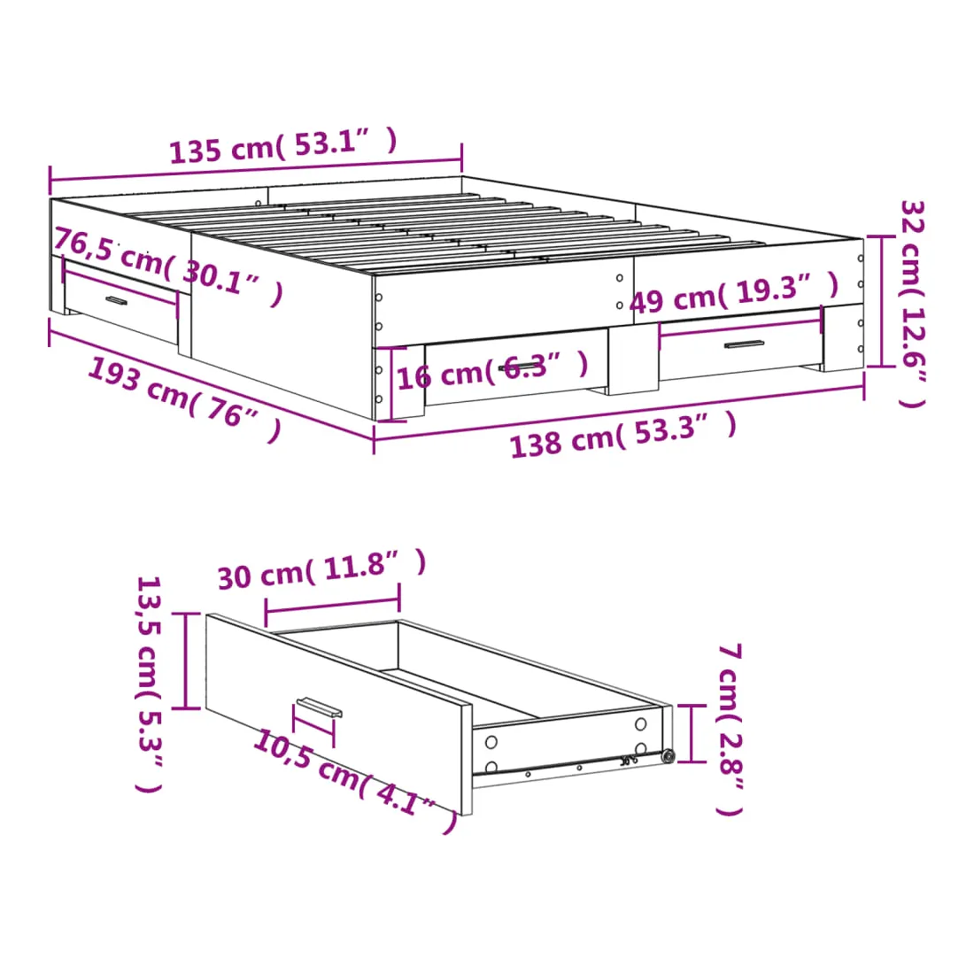 - Dimensions des tiroirs de lit (L) : 76,5 x 31,5 x 13,5 cm (L x l x H)