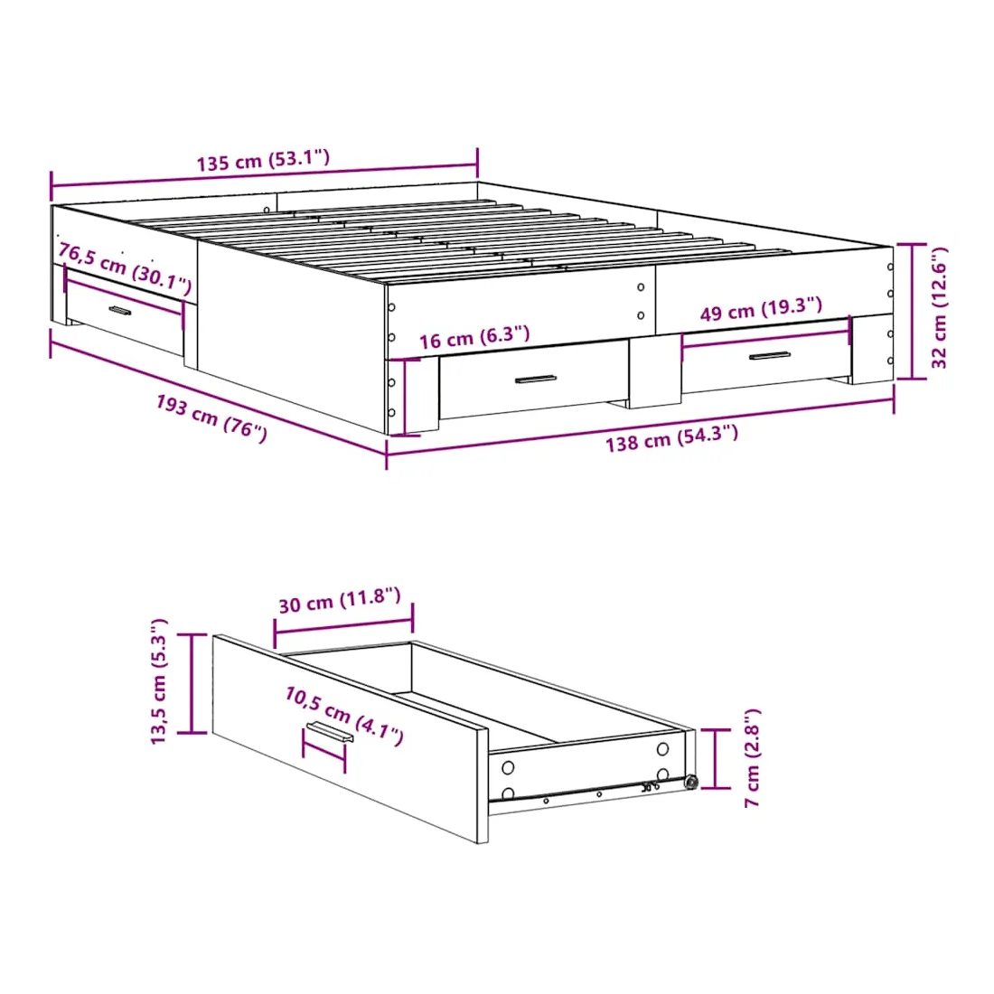 - Dimensions des tiroirs de lit (S) : 49 x 31,5 x 13,5 cm (L x l x H)