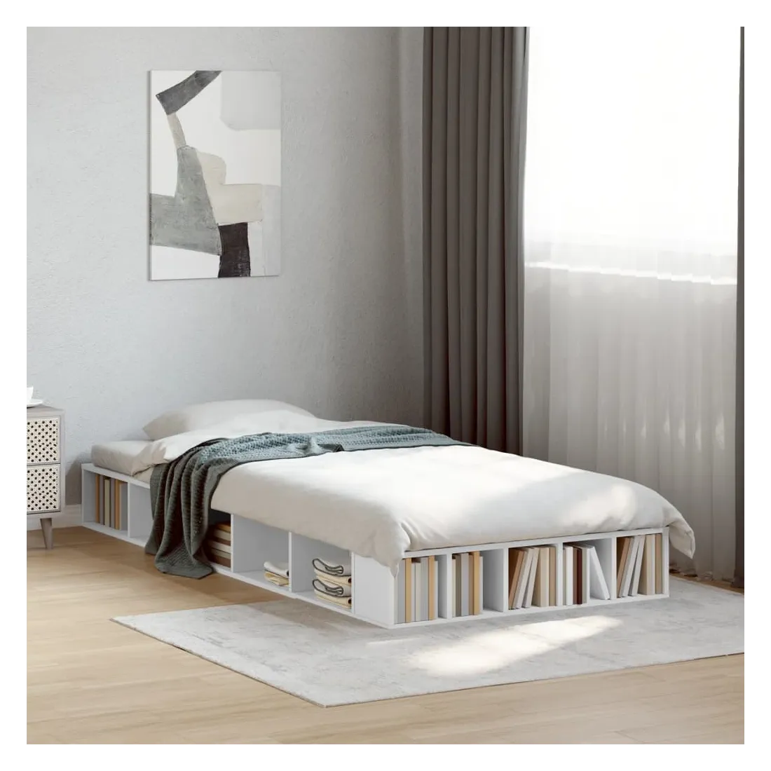 Obtenez une meilleure nuit de sommeil reposante grâce à ce cadre de lit ! Il est un supplément accueillant à toute chambre à coucher. Matériau durable : le cadre de lit est fabriquée en bois d'ingénierie. Le bois d'ingénierie est d'une qualité exceptionnelle avec une surface lisse et présente également de la résistance, de la stabilité et de la résistance à l'humidité.Lattes pour un soutien optimal : le cadre de lit est complété par des lattes pour offrir un soutien et une respirabilité essentiels à votre matelas.Fonction de rangement : ce cadre de lit offre des compartiments ouverts pour garder vos magazines, livres, jouets et autres petits objets bien organisés. Bon à savoir :Un matelas n'est pas inclus avec ce lit. Nous offrons une sélection variée de matelas. Vous pouvez consulter notre boutique pour trouver un matelas assorti.