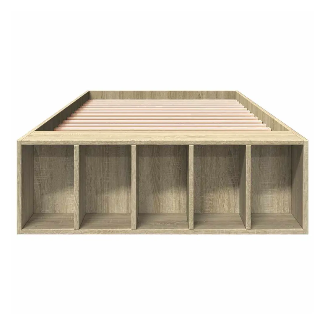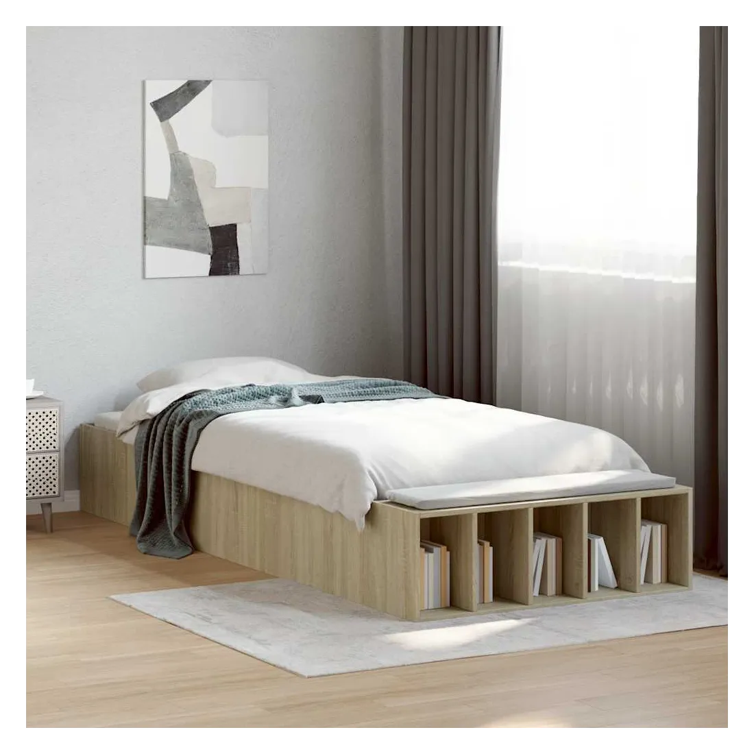 Ajoutez une touche moderne à votre chambre à coucher avec ce cadre de lit ! Il apportera une touche pratique et décorative à votre espace de vie. Matériau durable : le cadre de lit est fabriquée en bois d'ingénierie. Le bois d'ingénierie est d'une qualité exceptionnelle avec une surface lisse et présente également de la résistance, de la stabilité et de la résistance à l'humidité.Lattes robustes : les lattes de contreplaqué assurent une bonne répartition du poids, garantissant que le matelas reste en place à chaque torsion de votre corps pendant le sommeil.Fonction de rangement : les compartiments de lit inclus offrent un grand espace de rangement pour ranger vos articles essentiels, gardant votre chambre propre et bien rangée. Bon à savoir :Un matelas n'est pas inclus avec ce lit. Nous offrons une sélection variée de matelas. Vous pouvez consulter notre boutique pour trouver un matelas assorti.