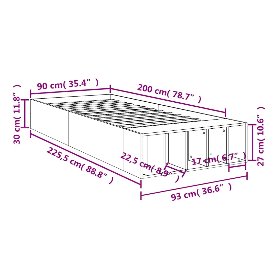- Dimensions totales : 225,5 x 93 x 30 cm (L x l x H)