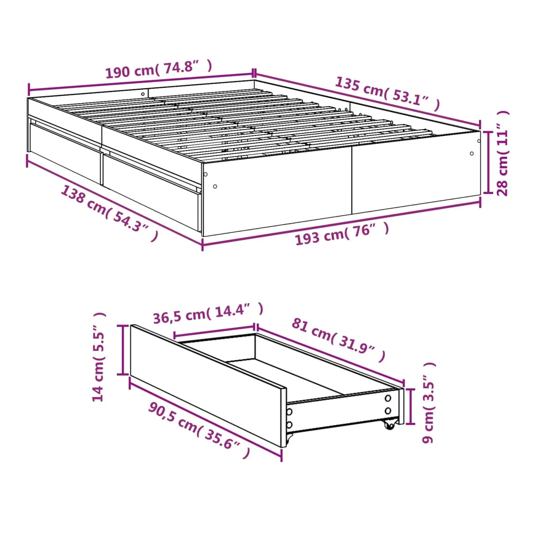 Ajoutez une touche moderne à votre chambre à coucher avec ce cadre de lit avec tiroirs ! Il apportera une touche pratique et décorative à votre espace de vie. Matériau durable : le cadre de lit est fabriquée en bois d'ingénierie. Le bois d'ingénierie est d'une qualité exceptionnelle avec une surface lisse et présente également de la résistance, de la stabilité et de la résistance à l'humidité.Lattes robustes : les lattes de contreplaqué assurent une bonne répartition du poids, garantissant que le matelas reste en place à chaque torsion de votre corps pendant le sommeil.Fonction de rangement : les tiroirs de lit inclus offrent suffisamment d'espace de rangement pour ranger vos articles essentiels, gardant votre pièce propre et bien rangée. Bon à savoir :Un matelas n'est pas inclus avec ce lit. Nous offrons une sélection variée de matelas. Vous pouvez consulter notre boutique pour trouver un matelas assorti.