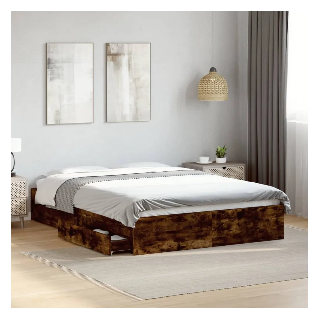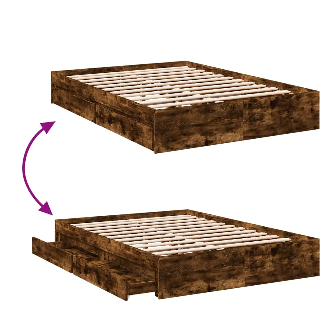 Ajoutez une touche moderne à votre chambre à coucher avec ce cadre de lit avec tiroirs ! Il apportera une touche pratique et décorative à votre espace de vie. Matériau durable : le cadre de lit est fabriquée en bois d'ingénierie. Le bois d'ingénierie est d'une qualité exceptionnelle avec une surface lisse et présente également de la résistance, de la stabilité et de la résistance à l'humidité.Lattes robustes : les lattes de contreplaqué assurent une bonne répartition du poids, garantissant que le matelas reste en place à chaque torsion de votre corps pendant le sommeil.Fonction de rangement : les tiroirs de lit inclus offrent suffisamment d'espace de rangement pour ranger vos articles essentiels, gardant votre pièce propre et bien rangée. Bon à savoir :Un matelas n'est pas inclus avec ce lit. Nous offrons une sélection variée de matelas. Vous pouvez consulter notre boutique pour trouver un matelas assorti.