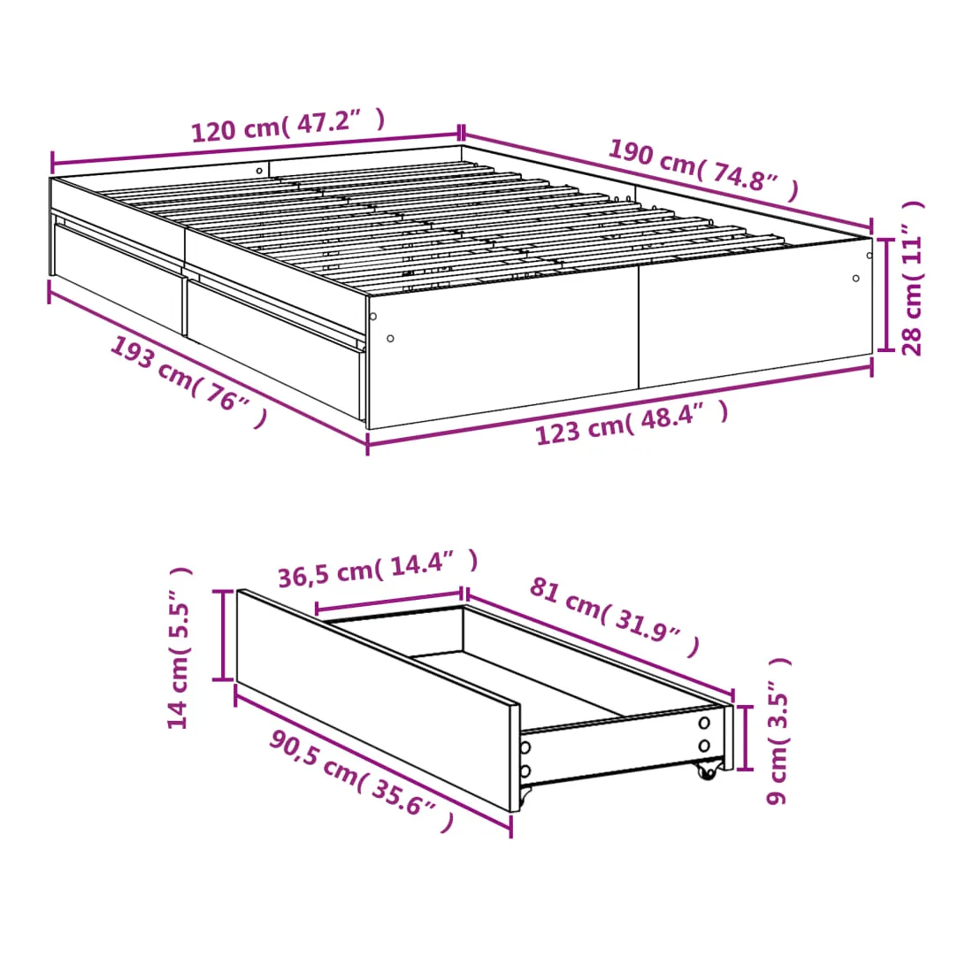 - Dimensions des tiroirs de lit (chacun) : 90,5 x 36,5 x 14 cm (L x l x H)