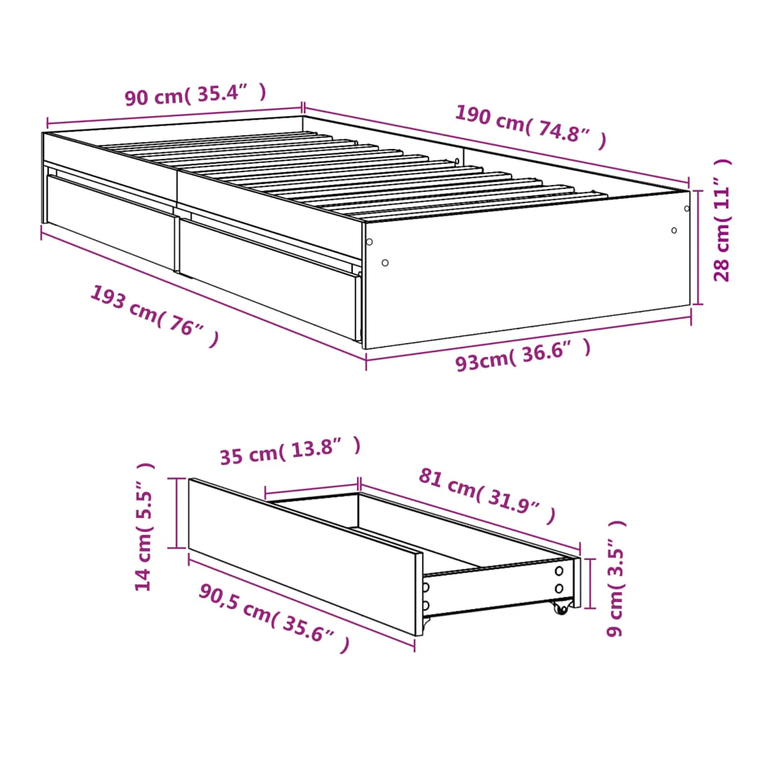 - Dimensions des tiroirs de lit (chacun) : 90,5 x 35 x 14 cm (L x l x H)