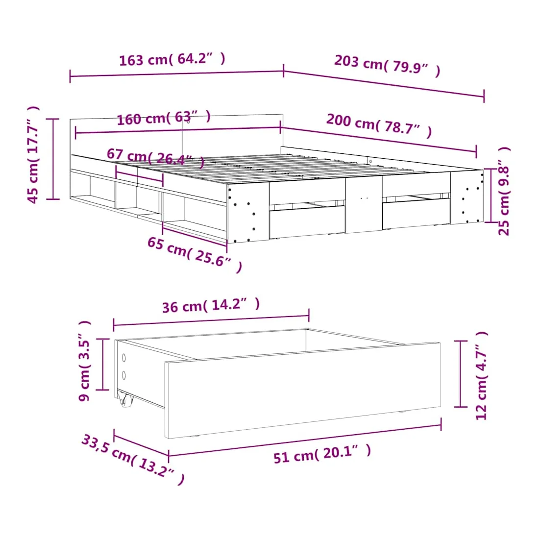 Ajoutez une touche moderne à votre chambre à coucher avec ce cadre de lit avec tiroirs ! Il apportera une touche pratique et décorative à votre espace de vie. Matériau durable : le cadre de lit est fabriquée en bois d'ingénierie. Le bois d'ingénierie est d'une qualité exceptionnelle avec une surface lisse et présente également de la résistance, de la stabilité et de la résistance à l'humidité.Lattes robustes : les lattes de contreplaqué assurent une bonne répartition du poids, garantissant que le matelas reste en place à chaque torsion de votre corps pendant le sommeil.Fonction de rangement : les tiroirs de lit et les compartiments latéraux inclus offrent suffisamment d'espace de rangement pour ranger vos articles essentiels, gardant votre pièce propre et bien rangée. Bon à savoir :Un matelas n'est pas inclus avec ce lit. Nous offrons une sélection variée de matelas. Vous pouvez consulter notre boutique pour trouver un matelas assorti.
