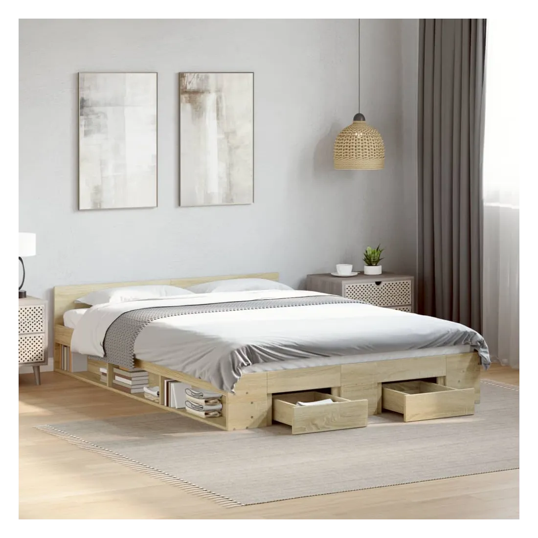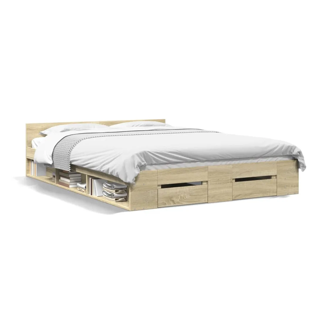 Ajoutez une touche moderne à votre chambre à coucher avec ce cadre de lit avec tiroirs ! Il apportera une touche pratique et décorative à votre espace de vie. Matériau durable : le cadre de lit est fabriquée en bois d'ingénierie. Le bois d'ingénierie est d'une qualité exceptionnelle avec une surface lisse et présente également de la résistance, de la stabilité et de la résistance à l'humidité.Lattes robustes : les lattes de contreplaqué assurent une bonne répartition du poids, garantissant que le matelas reste en place à chaque torsion de votre corps pendant le sommeil.Fonction de rangement : les tiroirs de lit et les compartiments latéraux inclus offrent suffisamment d'espace de rangement pour ranger vos articles essentiels, gardant votre pièce propre et bien rangée. Bon à savoir :Un matelas n'est pas inclus avec ce lit. Nous offrons une sélection variée de matelas. Vous pouvez consulter notre boutique pour trouver un matelas assorti.