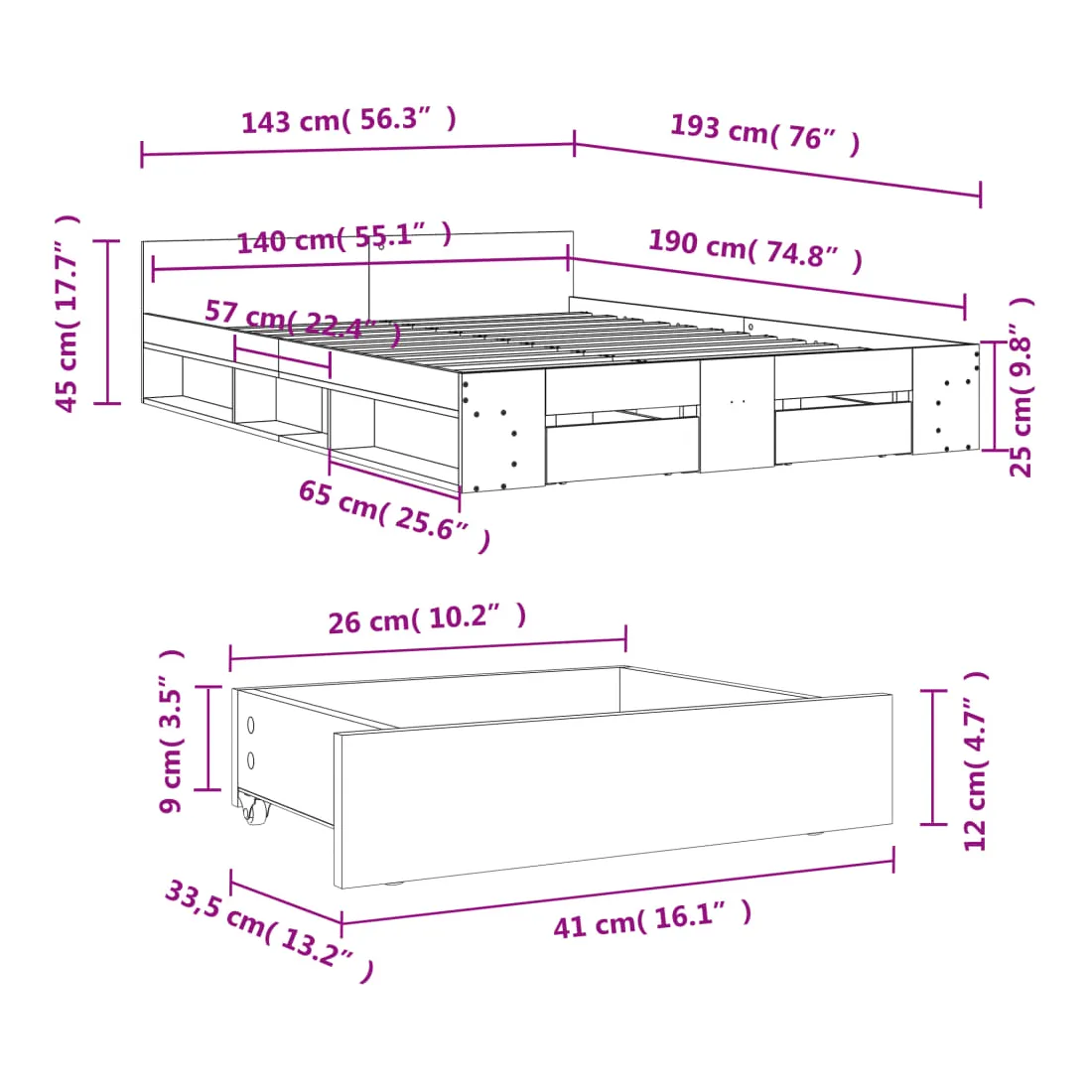 - Dimensions du tiroir de lit (chacun) : 41 x 33,5 x 12 cm (L x l x H)