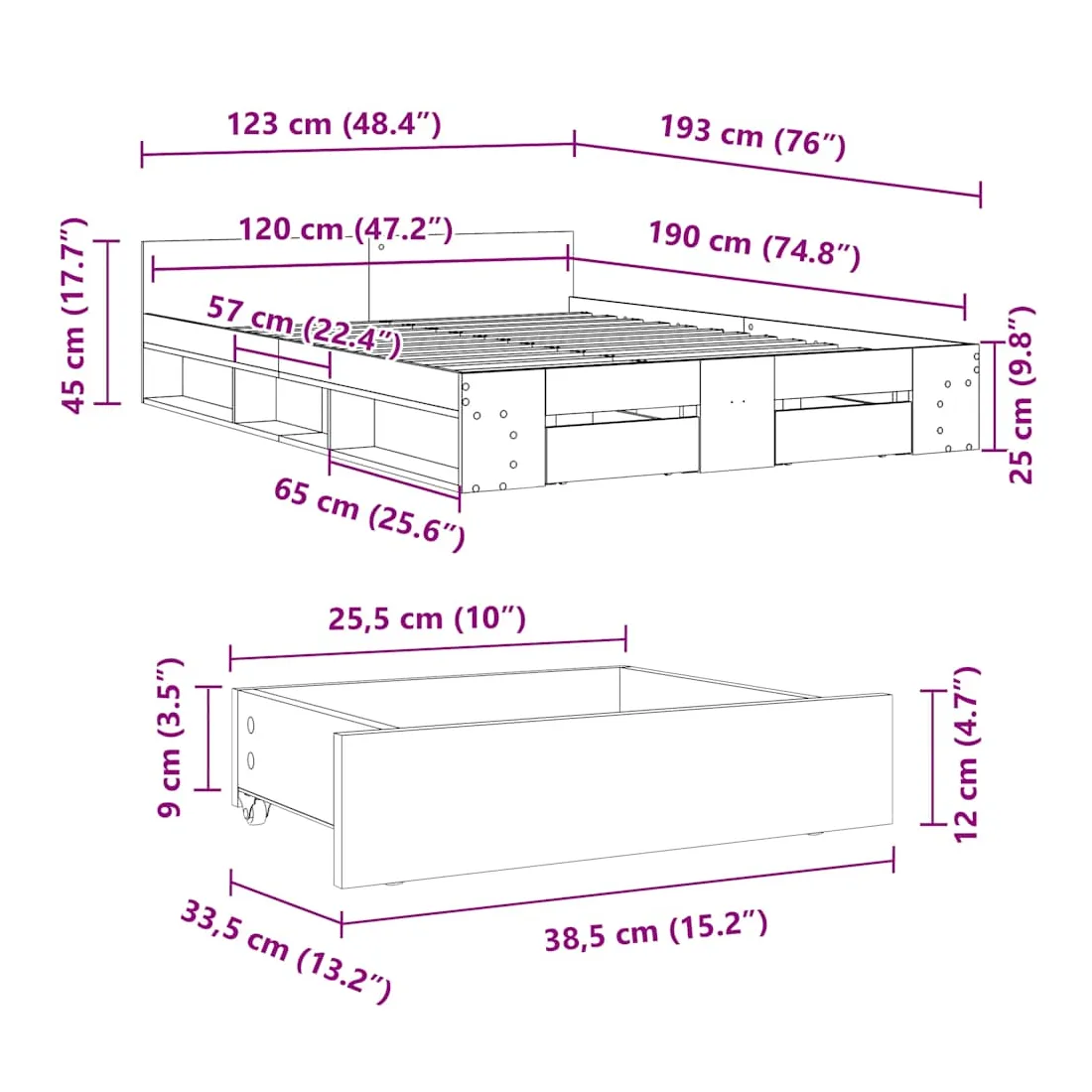 - Dimensions du tiroir de lit : 38,5 x 33,5 x 12 cm (L x l x H)