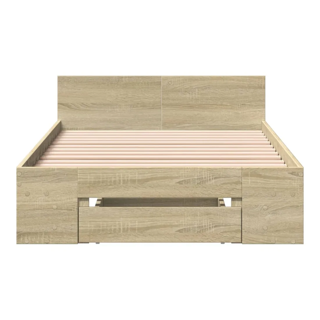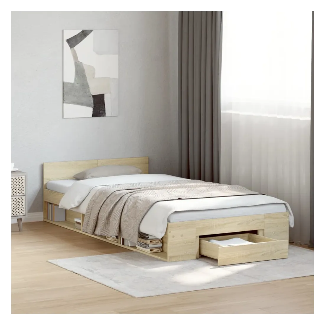 Ajoutez une touche moderne à votre chambre à coucher avec ce cadre de lit avec tiroir ! Il apportera une touche pratique et décorative à votre espace de vie. Matériau durable : le cadre de lit est fabriquée en bois d'ingénierie. Le bois d'ingénierie est d'une qualité exceptionnelle avec une surface lisse et présente également de la résistance, de la stabilité et de la résistance à l'humidité.Lattes robustes : les lattes de contreplaqué assurent une bonne répartition du poids, garantissant que le matelas reste en place à chaque torsion de votre corps pendant le sommeil.Fonction de rangement : le tiroir de lit et les compartiments latéraux inclus offrent suffisamment d'espace de rangement pour ranger vos articles essentiels, gardant votre pièce propre et bien rangée. Bon à savoir :Un matelas n'est pas inclus avec ce lit. Nous offrons une sélection variée de matelas. Vous pouvez consulter notre boutique pour trouver un matelas assorti.