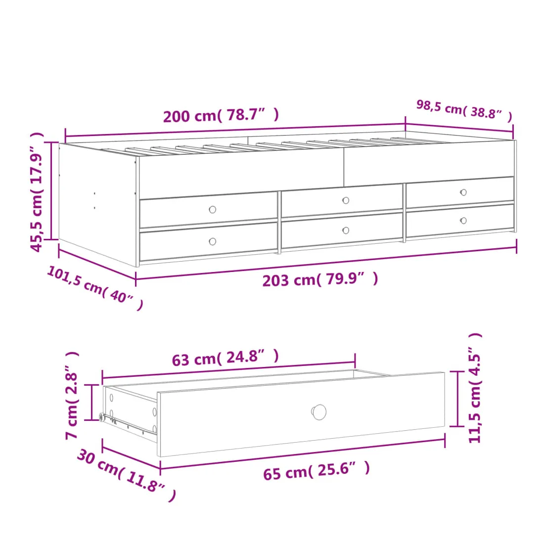 - Dimensions des tiroirs de lit (chacun) : 65 x 30 x 11,5 cm (L x l x H)