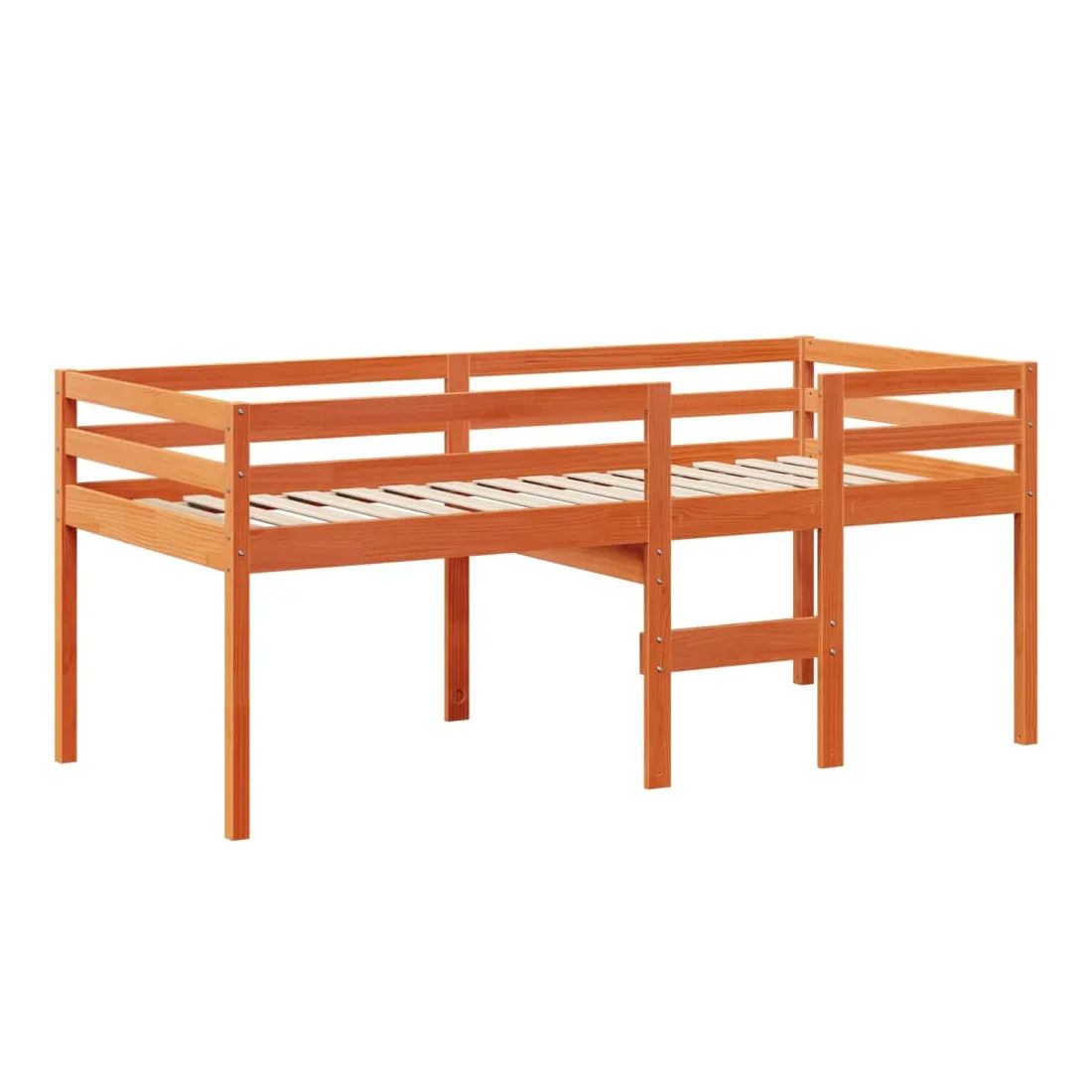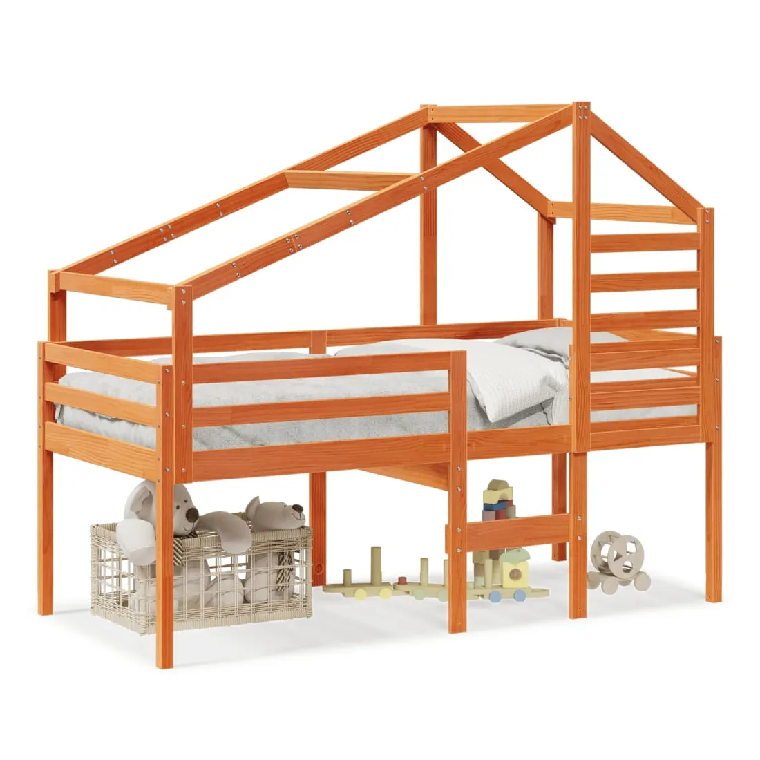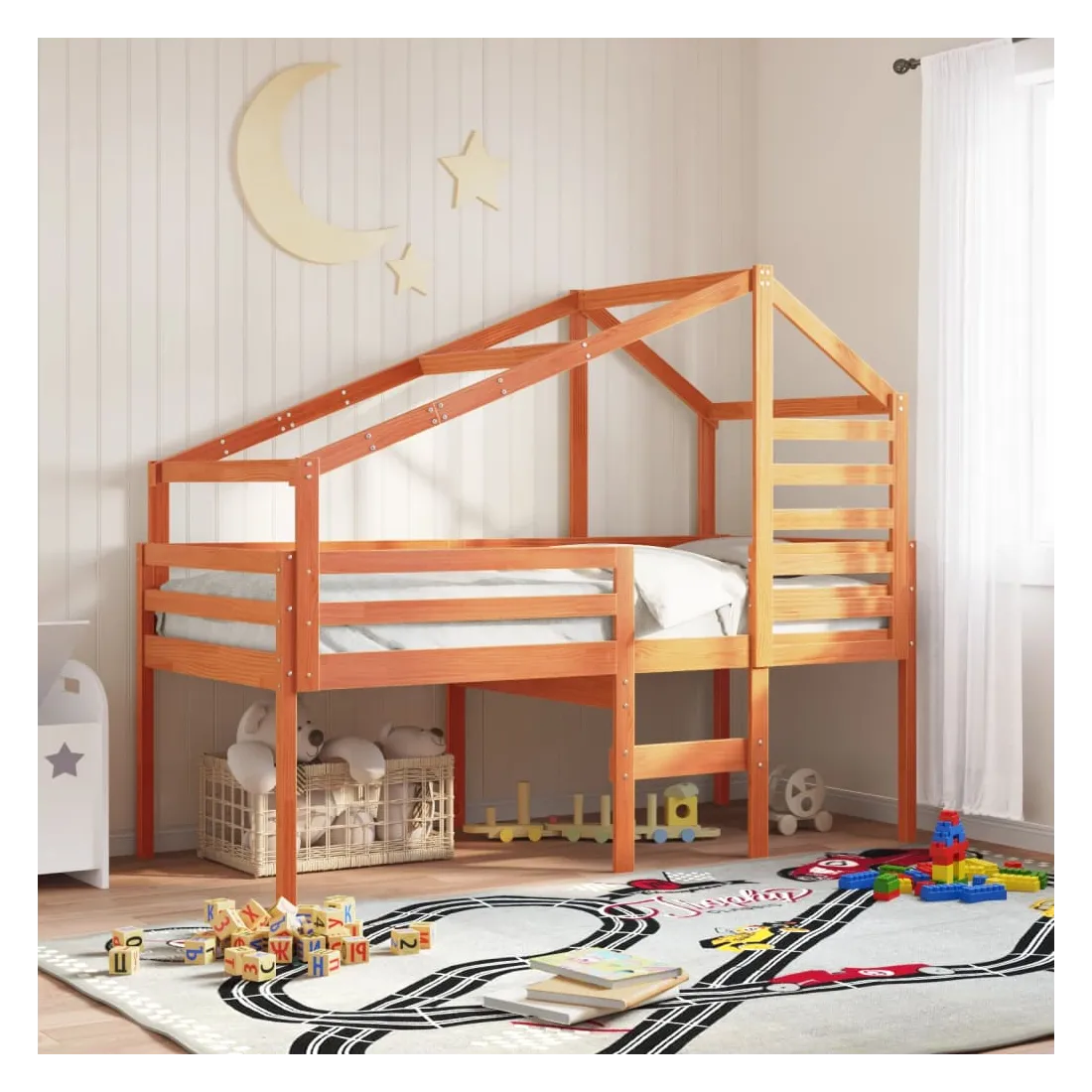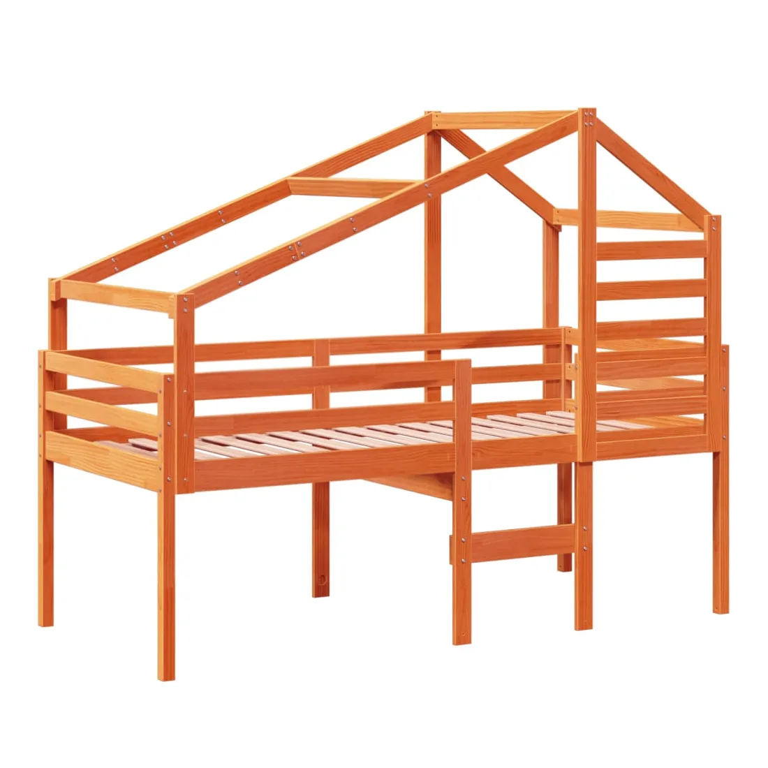 Ce lit haut, dont la polyvalence est au cœur de son design, est une combinaison parfaite de style moderne et élégant et de praticité. Il est idéal pour les petites pièces. Bois de pin massif : le bois de pin massif est un matériau naturel magnifique. Le bois de pin a un grain droit et les nœuds donnent au matériau son aspect caractéristique et rustique.Fonction pratique : le lit surélevé offre un excellent moyen d'utiliser l'espace au sol dans la chambre de votre enfant, vous pouvez le combiner avec un rideau de jeu cool, un matelas de jeu et un panneau d'abri comme un coin de jeu ou utiliser la zone en dessous pour le stockage. Les lattes en contreplaqué offrent un soutien supplémentaire à votre lit. Elles prolongent la durée de vie de votre matelas en absorbant la majeure partie de la tension et du poids du lit.Design sûr : l'échelle intégrée du lit surélevé facilite l'entrée et la sortie du lit, et les garde-corps garantissent la sécurité de vos jeunes pendant qu'ils dorment.Très amusant : en combinant le toit avec le lit de votre enfant, vous pouvez créer une cachette qui permettra à votre enfant de s'amuser à l'heure du coucher. Cette addition innovante non seulement sera un point focal passionnant, mais aussi apportera de la fantaisie et de l'amusement dans la chambre d'enfant.Porte latérale ouverte : le toit est doté d'une porte latérale ouverte qui permet à vos enfants d'entrer et de sortir facilement du lit. Bon à savoir :Un matelas n'est pas inclus avec ce lit. Nous offrons une sélection variée de matelas. Vous pouvez consulter notre boutique pour trouver un matelas assorti.
