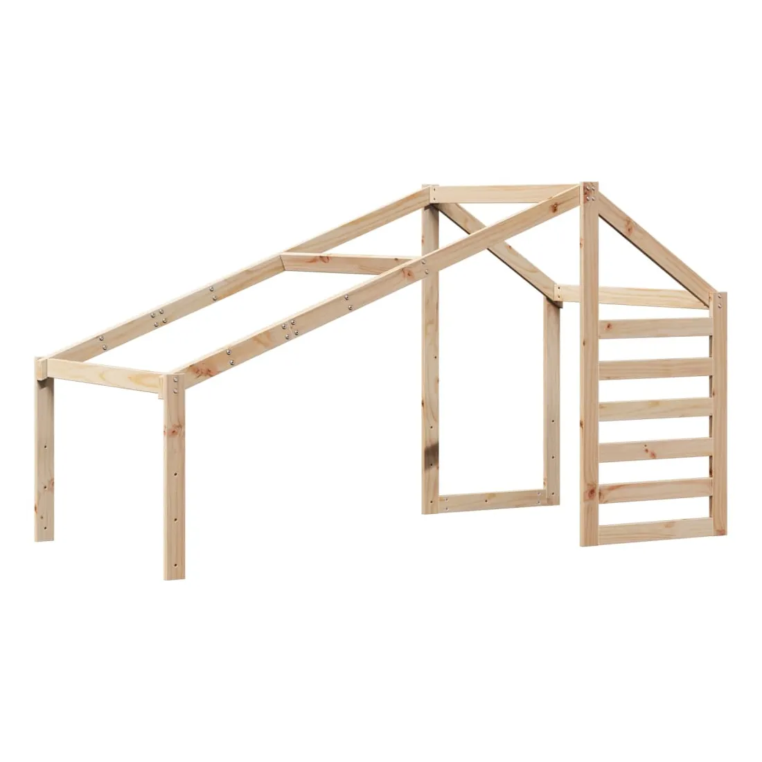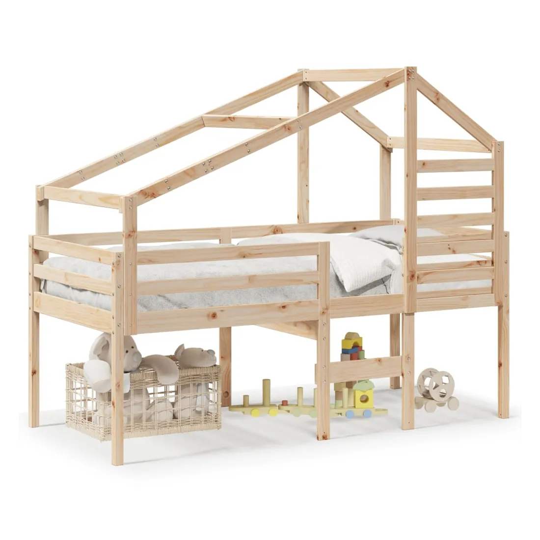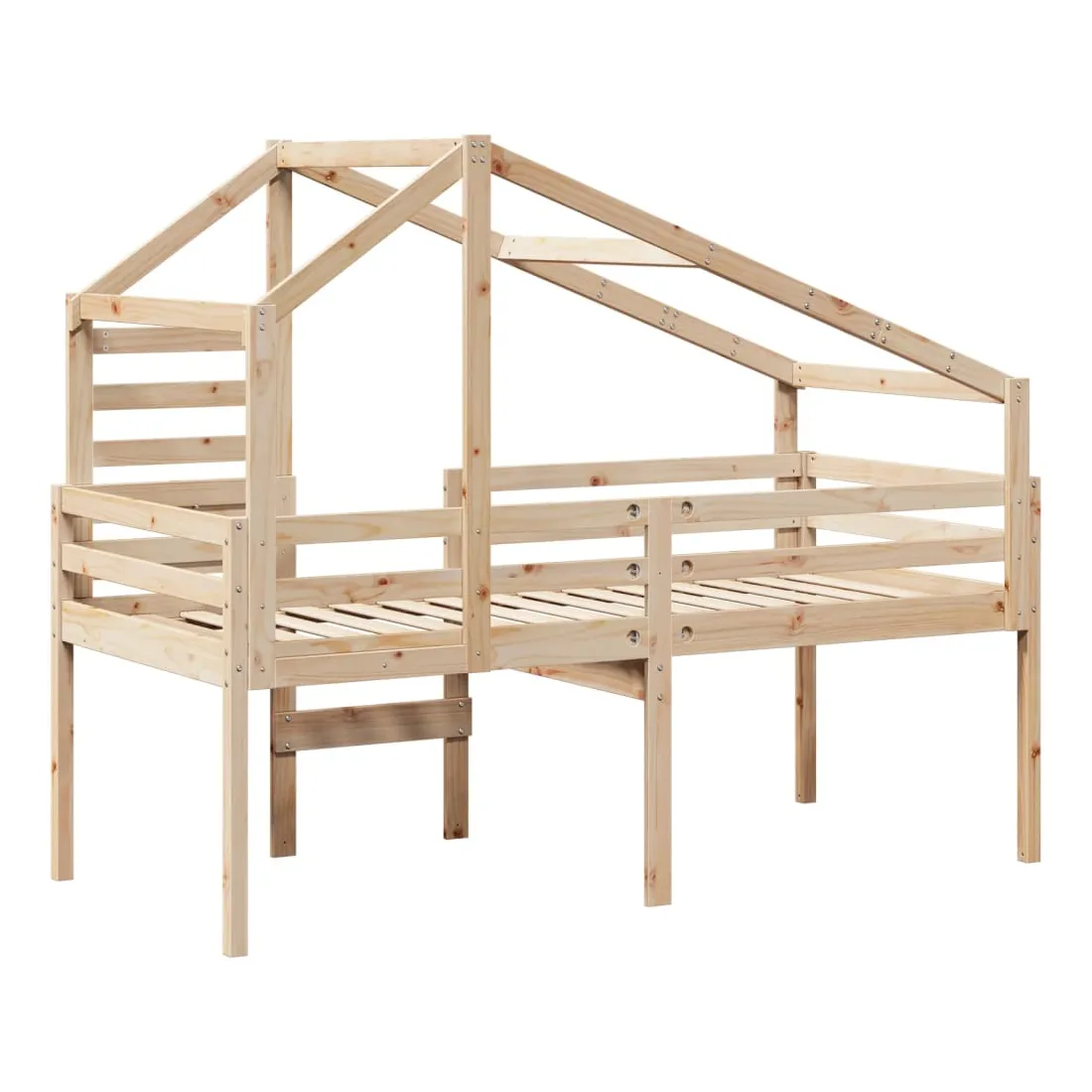 Ce lit haut, dont la polyvalence est au cœur de son design, est une combinaison parfaite de style moderne et élégant et de praticité. Il est idéal pour les petites pièces. Bois de pin massif : le bois de pin massif est un matériau naturel magnifique. Le bois de pin a un grain droit et les nœuds donnent au matériau son aspect caractéristique et rustique.Fonction pratique : le lit surélevé offre un excellent moyen d'utiliser l'espace au sol dans la chambre de votre enfant, vous pouvez le combiner avec un rideau de jeu cool, un matelas de jeu et un panneau d'abri comme un coin de jeu ou utiliser la zone en dessous pour le stockage. Les lattes en contreplaqué offrent un soutien supplémentaire à votre lit. Elles prolongent la durée de vie de votre matelas en absorbant la majeure partie de la tension et du poids du lit.Design sûr : l'échelle intégrée du lit surélevé facilite l'entrée et la sortie du lit, et les garde-corps garantissent la sécurité de vos jeunes pendant qu'ils dorment.Très amusant : en combinant le toit avec le lit de votre enfant, vous pouvez créer une cachette qui permettra à votre enfant de s'amuser à l'heure du coucher. Cette addition innovante non seulement sera un point focal passionnant, mais aussi apportera de la fantaisie et de l'amusement dans la chambre d'enfant.Porte latérale ouverte : le toit est doté d'une porte latérale ouverte qui permet à vos enfants d'entrer et de sortir facilement du lit. Bon à savoir :Un matelas n'est pas inclus avec ce lit. Nous offrons une sélection variée de matelas. Vous pouvez consulter notre boutique pour trouver un matelas assorti.