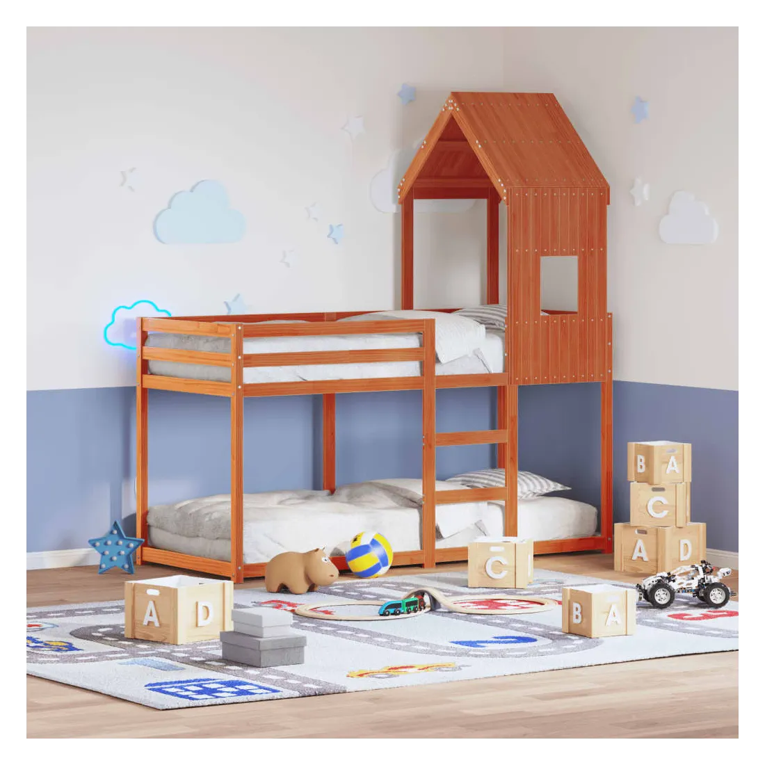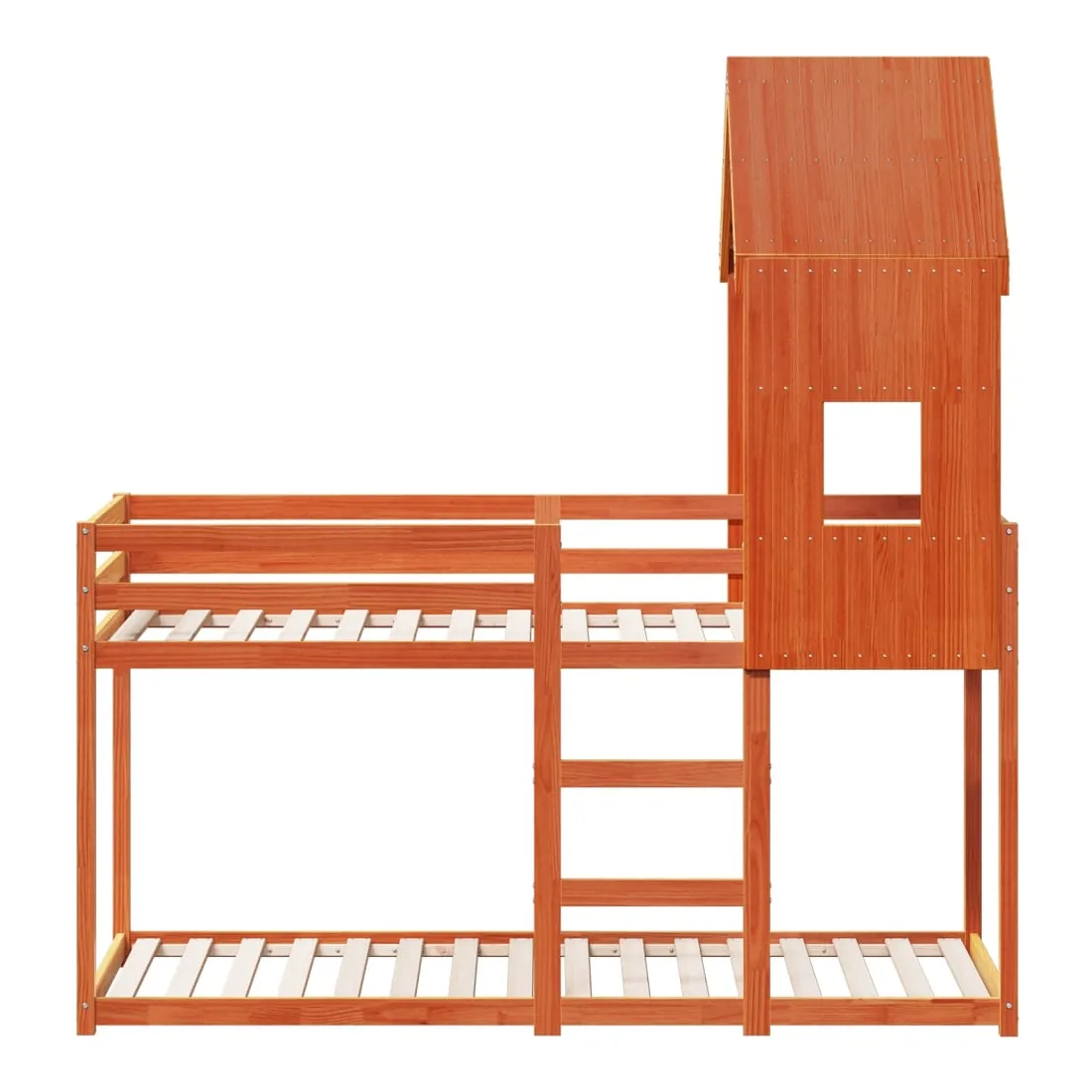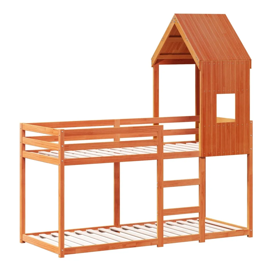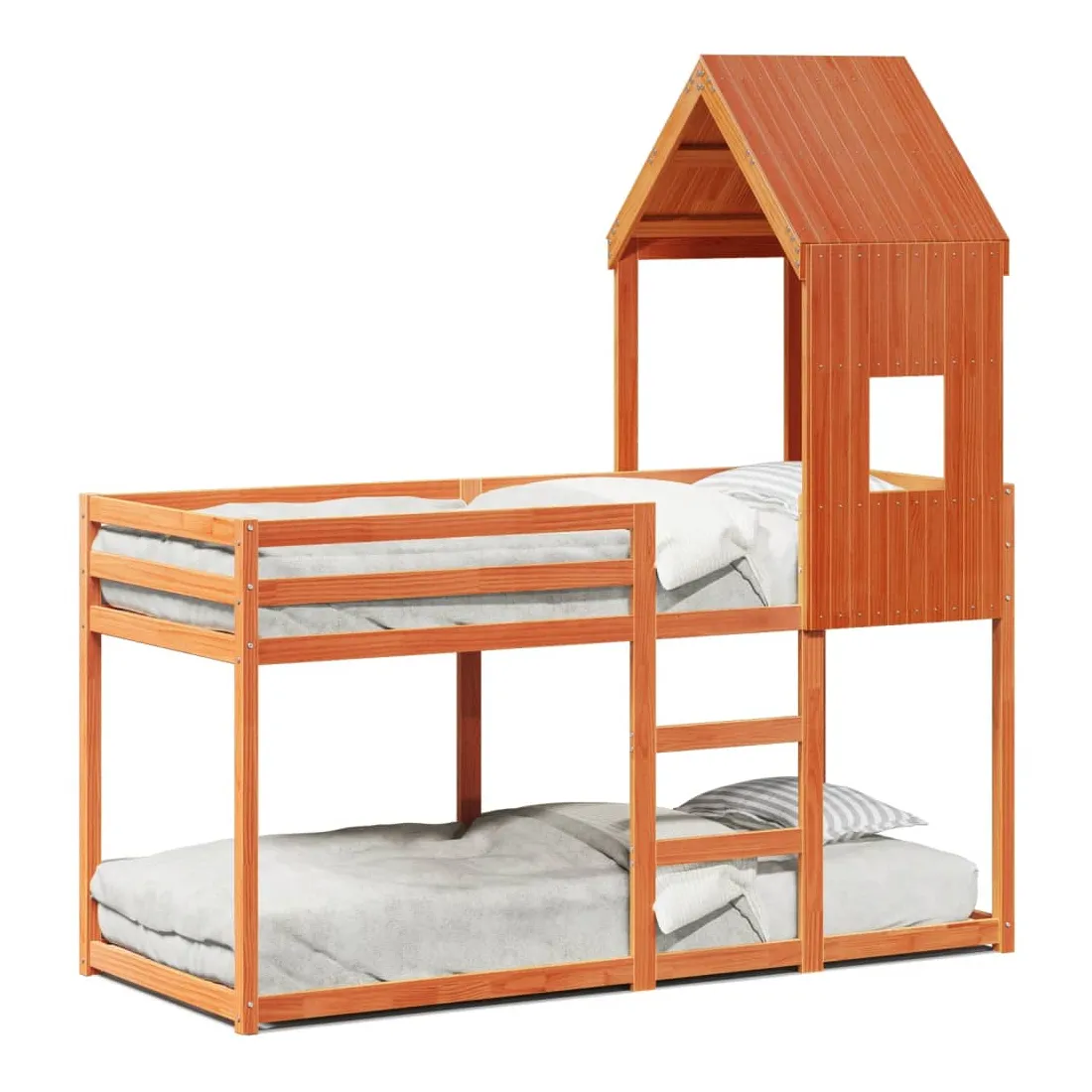 Ce lit superposé pour enfants avec toit est élégant et fonctionnel, ce qui en fait un ajout parfait à toute pièce avec un espace limité. Bois de pin massif : le bois de pin massif est un matériau naturel magnifique. Le bois de pin a un grain droit et les nœuds donnent au matériau son aspect caractéristique et rustique.Design sûr : le lit surélevé est conçu dans un souci de sécurité. Il comprend des garde-corps qui empêchent l'utilisateur de rouler pendant son sommeil.Lattes de contreplaqué : les lattes de contreplaqué assurent une bonne répartition du poids, garantissant que le matelas reste en place à chaque torsion de votre corps pendant le sommeil.Très amusant : en combinant le toit avec le lit de votre enfant, vous pouvez créer une cachette qui permettra à votre enfant de s'amuser à l'heure du coucher. Cette addition innovante non seulement sera un point focal passionnant, mais aussi apportera de la fantaisie et de l'amusement dans la chambre d'enfant.Convient aux espaces limités : le cadre de lit est un excellent choix pour toute pièce dont l'espace est limité, il fournit deux lits individuels avec un design compact.Porte latérale ouverte : le toit est doté d'une porte latérale ouverte qui permet à vos enfants d'entrer et de sortir facilement du lit. Bon à savoir :Un matelas n'est pas inclus avec ce lit. Nous offrons une sélection variée de matelas. Vous pouvez consulter notre boutique pour trouver un matelas assorti.