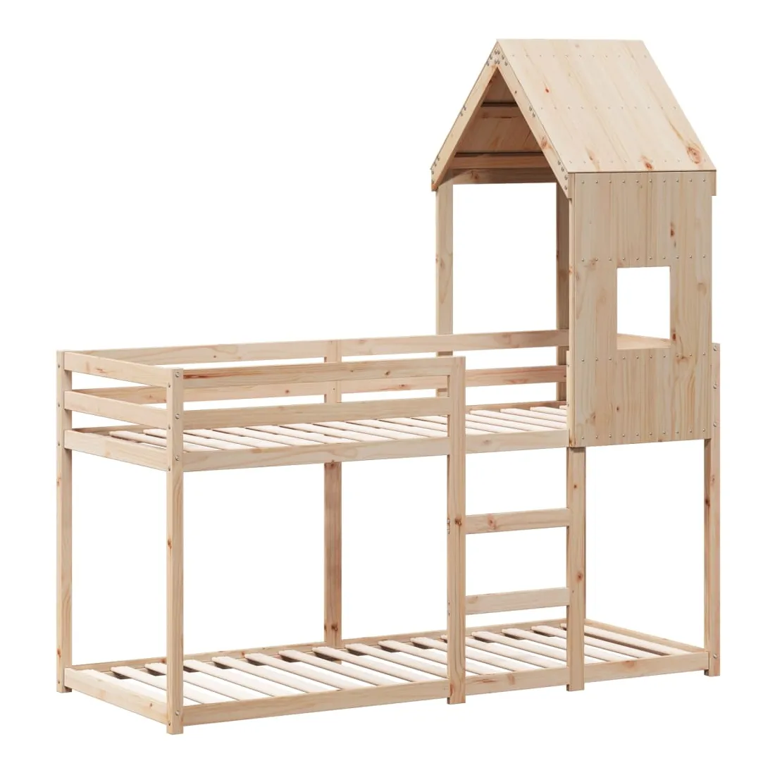 Ce lit superposé pour enfants avec toit est élégant et fonctionnel, ce qui en fait un ajout parfait à toute pièce avec un espace limité. Bois de pin massif : le bois de pin massif est un matériau naturel magnifique. Le bois de pin a un grain droit et les nœuds donnent au matériau son aspect caractéristique et rustique.Design sûr : le lit surélevé est conçu dans un souci de sécurité. Il comprend des garde-corps qui empêchent l'utilisateur de rouler pendant son sommeil.Lattes de contreplaqué : les lattes de contreplaqué assurent une bonne répartition du poids, garantissant que le matelas reste en place à chaque torsion de votre corps pendant le sommeil.Très amusant : en combinant le toit avec le lit de votre enfant, vous pouvez créer une cachette qui permettra à votre enfant de s'amuser à l'heure du coucher. Cette addition innovante non seulement sera un point focal passionnant, mais aussi apportera de la fantaisie et de l'amusement dans la chambre d'enfant.Convient aux espaces limités : le cadre de lit est un excellent choix pour toute pièce dont l'espace est limité, il fournit deux lits individuels avec un design compact.Porte latérale ouverte : le toit est doté d'une porte latérale ouverte qui permet à vos enfants d'entrer et de sortir facilement du lit. Bon à savoir :Un matelas n'est pas inclus avec ce lit. Nous offrons une sélection variée de matelas. Vous pouvez consulter notre boutique pour trouver un matelas assorti.