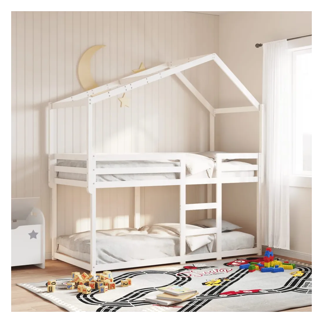 Ce lit superposé pour enfants avec toit est élégant et fonctionnel, ce qui en fait un ajout parfait à toute pièce avec un espace limité. Bois de pin massif : le bois de pin massif est un matériau naturel magnifique. Le bois de pin a un grain droit et les nœuds donnent au matériau son aspect caractéristique et rustique.Design sûr : le lit surélevé est conçu dans un souci de sécurité. Il comprend des garde-corps qui empêchent l'utilisateur de rouler pendant son sommeil.Lattes de contreplaqué : les lattes de contreplaqué assurent une bonne répartition du poids, garantissant que le matelas reste en place à chaque torsion de votre corps pendant le sommeil.Très amusant : en combinant le toit avec le lit de votre enfant, vous pouvez créer une cachette qui permettra à votre enfant de s'amuser à l'heure du coucher. Cette addition innovante non seulement sera un point focal passionnant, mais aussi apportera de la fantaisie et de l'amusement dans la chambre d'enfant.Convient aux espaces limités : le cadre de lit est un excellent choix pour toute pièce dont l'espace est limité, il fournit deux lits individuels avec un design compact.Porte latérale ouverte : le toit est doté d'une porte latérale ouverte qui permet à vos enfants d'entrer et de sortir facilement du lit. Bon à savoir :Un matelas n'est pas inclus avec ce lit. Nous offrons une sélection variée de matelas. Vous pouvez consulter notre boutique pour trouver un matelas assorti.