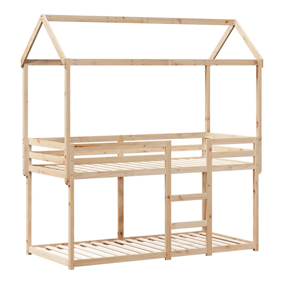 Ce lit superposé pour enfants avec toit est élégant et fonctionnel, ce qui en fait un ajout parfait à toute pièce avec un espace limité. Bois de pin massif : le bois de pin massif est un matériau naturel magnifique. Le bois de pin a un grain droit et les nœuds donnent au matériau son aspect caractéristique et rustique.Design sûr : le lit surélevé est conçu dans un souci de sécurité. Il comprend des garde-corps qui empêchent l'utilisateur de rouler pendant son sommeil.Lattes de contreplaqué : les lattes de contreplaqué assurent une bonne répartition du poids, garantissant que le matelas reste en place à chaque torsion de votre corps pendant le sommeil.Très amusant : en combinant le toit avec le lit de votre enfant, vous pouvez créer une cachette qui permettra à votre enfant de s'amuser à l'heure du coucher. Cette addition innovante non seulement sera un point focal passionnant, mais aussi apportera de la fantaisie et de l'amusement dans la chambre d'enfant.Convient aux espaces limités : le cadre de lit est un excellent choix pour toute pièce dont l'espace est limité, il fournit deux lits individuels avec un design compact.Porte latérale ouverte : le toit est doté d'une porte latérale ouverte qui permet à vos enfants d'entrer et de sortir facilement du lit. Bon à savoir :Un matelas n'est pas inclus avec ce lit. Nous offrons une sélection variée de matelas. Vous pouvez consulter notre boutique pour trouver un matelas assorti.