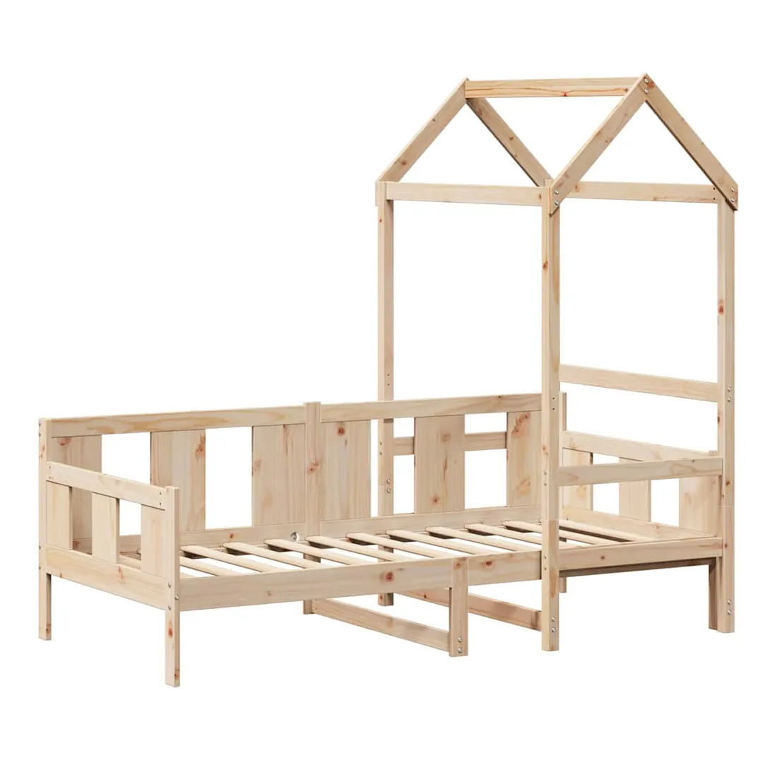 Ce lit de jour polyvalent en bois peut être utilisé comme un lit dans la chambre à coucher et est également idéal comme un canapé dans le salon. Il s'adapte parfaitement à vos différents besoins, vous offrant beaucoup d'espace pour dormir et vous reposer. Bois de pin massif : le bois de pin massif est un matériau naturel magnifique. Le bois de pin a un grain droit et les nœuds donnent au matériau son aspect caractéristique et rustique.Barres de lit sur 3 côtés : ce lit d'appoint présente un design unique sur le côté du lit, ce qui offre un sentiment de sécurité et ajoute une touche de style sophistiqué à votre intérieur.Design à lattes : le sommier à lattes en bois permet une meilleure circulation de l'air pour garder le matelas frais plus longtemps, améliorant la capacité de poids du lit et assurant la stabilité.Espace de rangement supplémentaire : profitez de l'espace sous le canapé pour ranger divers objets. Parfait pour ranger des boîtes pour organiser des vêtements, des jouets ou des couettes.Très amusant : en combinant le toit avec votre canapé-lit, vous pouvez créer une cachette qui permettra à votre enfant de s'amuser à l'heure du coucher. Cette addition innovante non seulement sera un point focal passionnant, mais aussi apportera de la fantaisie et de l'amusement dans la chambre.Porte latérale ouverte : le toit est doté d'une porte latérale ouverte qui permet à vos enfants d'entrer et de sortir facilement du lit. Bon à savoir :Un matelas n'est pas inclus avec ce lit. Nous offrons une sélection variée de matelas. Vous pouvez consulter notre boutique pour trouver un matelas assorti.