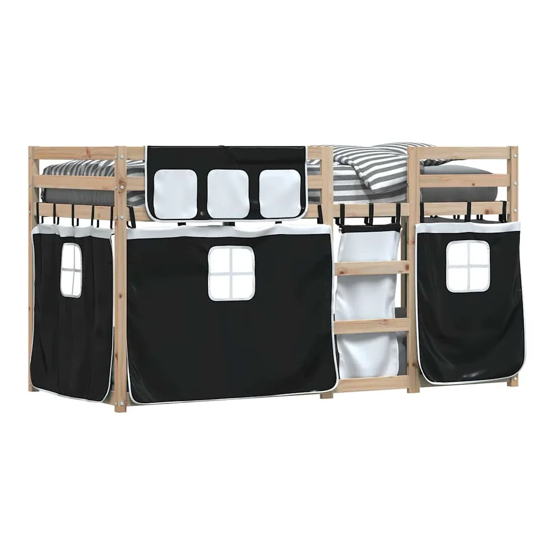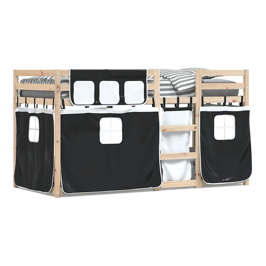 Ce lit superposé en bois est élégant et fonctionnel, ce qui en fait un supplément parfait à toute pièce dont l'espace est limité. Bois de pin massif : ce lit superposé est fabriqué en bois de pin massif pour plus de stabilité et de durabilité. Le bois de pin a un grain droit et les nœuds donnent au matériau son aspect rustique caractéristique.Très amusant : vous pouvez combiner les rideaux avec le lit superposé bas pour créer la base secrète de votre enfant, ce qui permet de s’amuser à l’heure du coucher et d’ajouter un point d'intérêt à la chambre à coucher !Barrières de sécurité : le lit supérieur est équipé de garde-corps de sécurité sur les 4 côtés, afin que votre enfant puisse dormir sans craindre de tomber.Échelle pratique : ce lit superposé double est doté d'une échelle qui permet de monter et de descendre dans et du lit en toute simplicité. Elle apporte également de la joie et transforme leur chambre en terrain de jeu intérieur. Bon à savoir :Un matelas n'est pas inclus avec ce lit. Nous offrons une sélection variée de matelas. Vous pouvez consulter notre boutique pour trouver un matelas assorti. Attention :Pour éviter qu'il ne bascule, ce produit doit être utilisé avec le dispositif de fixation murale fourni.